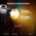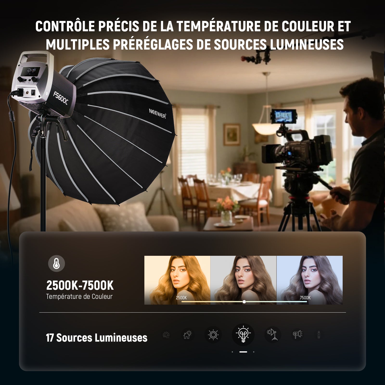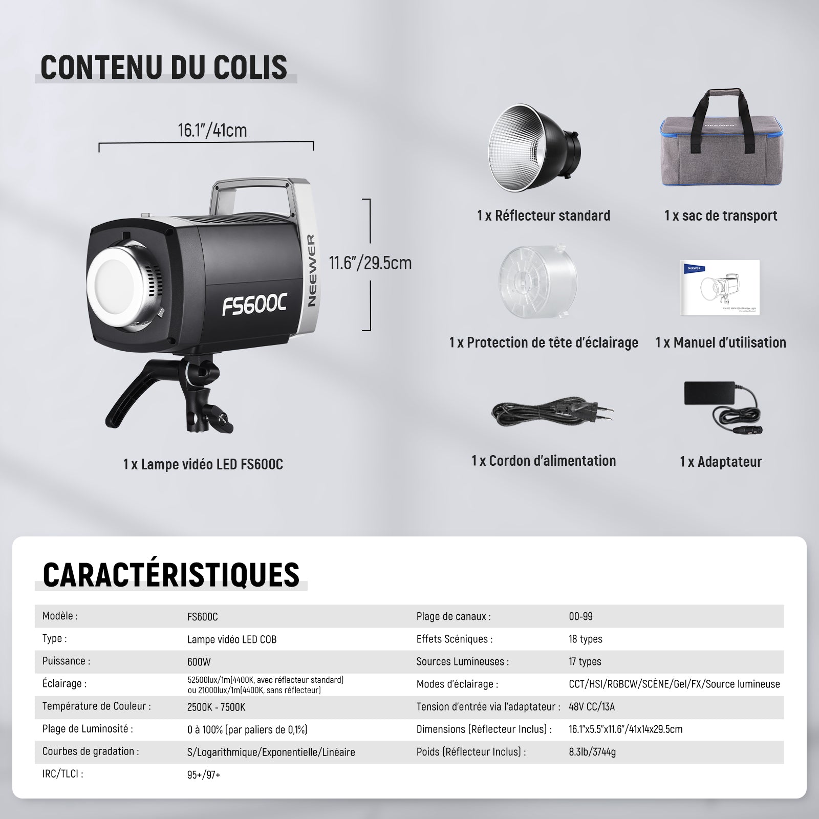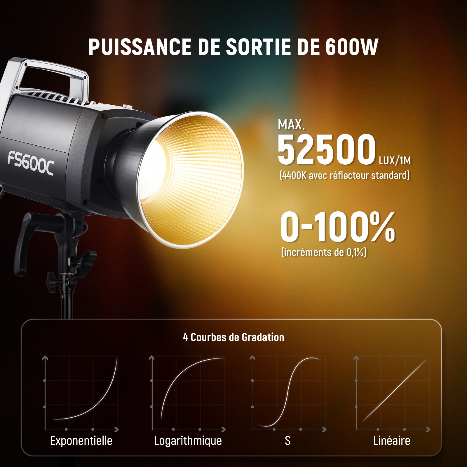 - Éclairage COB 600W ultime- Le FS600C, doté de LED et d'une technologie optique haut de gamme, est une version améliorée du FS300. Il offre un double flux lumineux et une luminosité nettement améliorée, jusqu'à 52 500 lux/1m (4 400K avec réflecteur) pour un éclairage constant. Grâce à sa poignée portable, il est idéal pour le streaming professionnel, les tournages, les portraits, la photographie, les interviews, les podcasts vidéographiques, les séances photo en studio, etc..