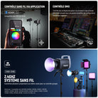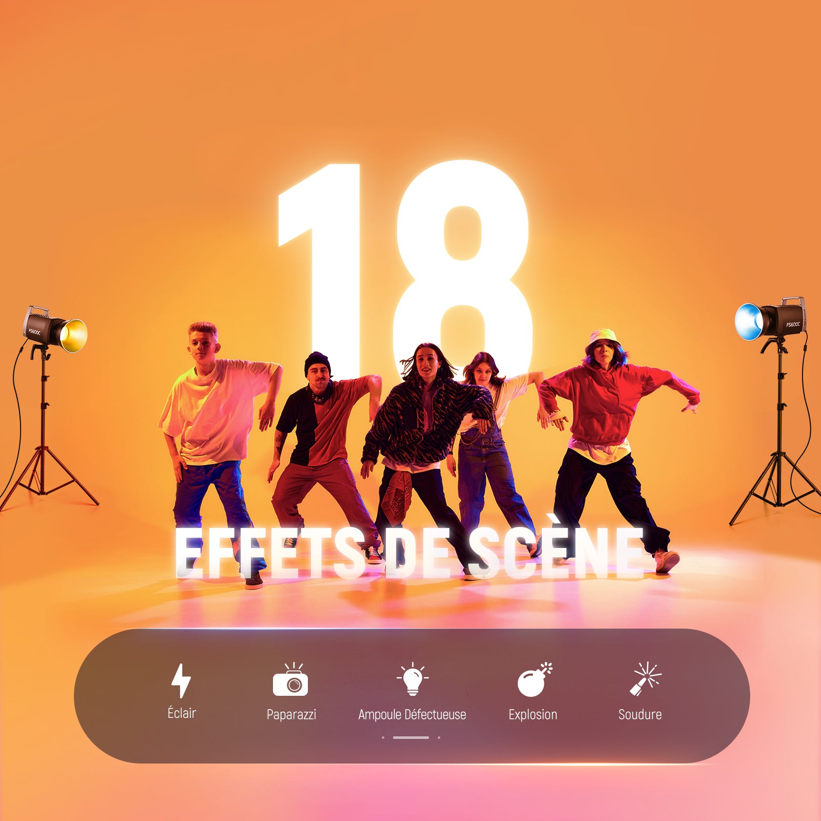 - Modes d’éclairage : CCT / HSI / RGBCW / SCÈNE / Gel / FX / Source lumineuse