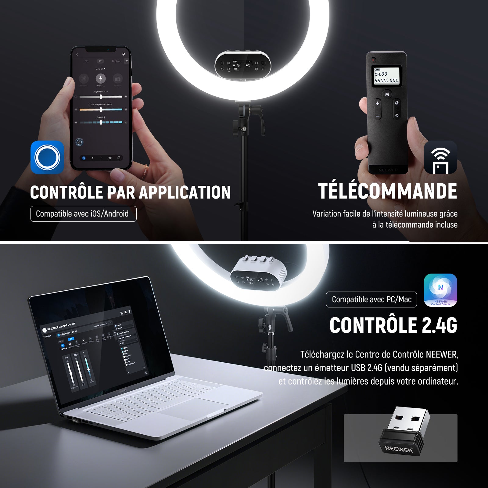- 【Contrôle via l'application et PC/Mac 2.4G】 Téléchargez l'application « NEEWER » sur votre smartphone et associez-la au RH100B via Bluetooth pour activer le contrôle intelligent de l'éclairage sans fil. Vous pouvez également contrôler la lumière annulaire portable pour les selfies avec votre téléphone depuis votre PC ou Mac en installant "NEEWER Control Center" et en connectant un émetteur sans fil USB 2.4G (vendu séparément) au port USB de votre ordinateur.