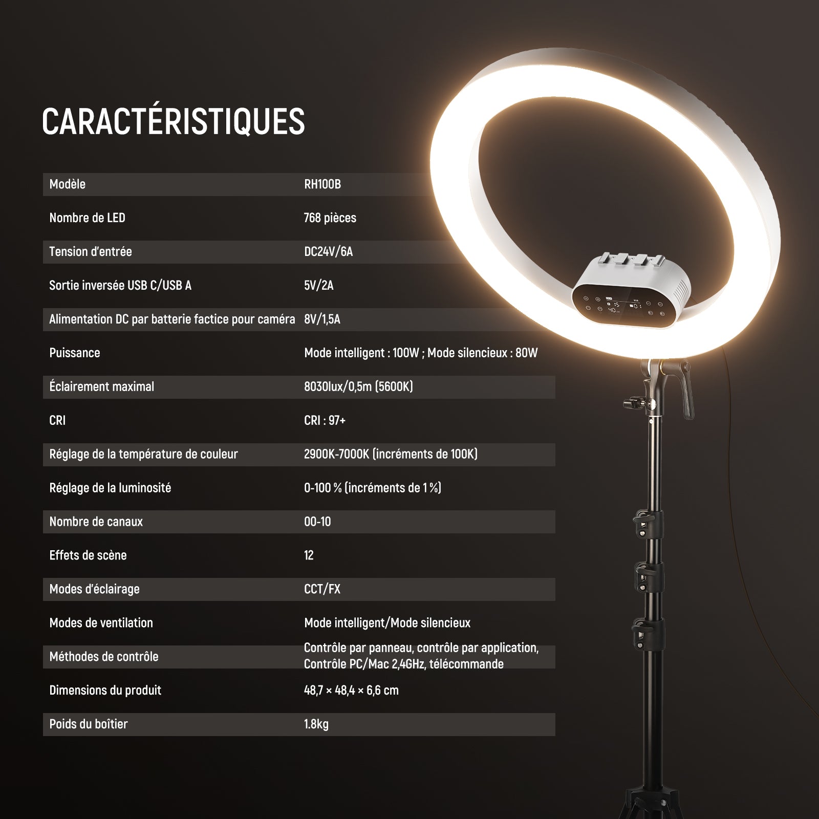 - 【Éclairage Annulaire Puissant de 19"】 Le RH100B avec 768 LED délivre 100W de puissance en mode Intelligent et 80W en mode silencieux, avec une luminosité jusqu'à 8030Lx/0,5m (5600K). La grande lumière circulaire fournit un éclairage continu et doux omnidirectionnel à 360° sans ombre. Utilisable comme éclairage principal ou lumière de remplissage pour le streaming en direct, les appels Zoom, les vlogs YouTube/TikTok, les films de voyage, les podcasts, les prises de vidéos de maquilleurs, les extensions de cils, les tatouages, les barbiers, la photographie en studio, etc.