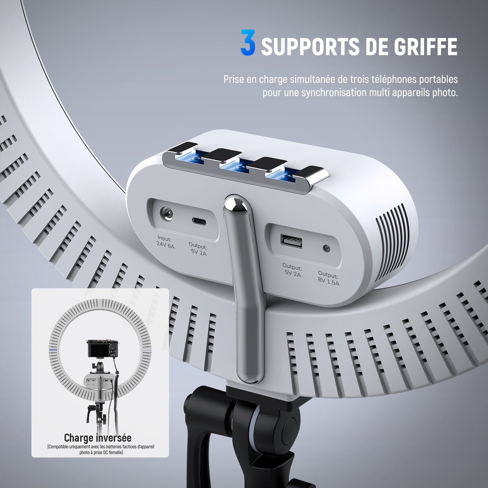 - 【3 Griffes Cold Shoe et 3 Supports Téléphone】 Avec 3 attaches à fente et 3 supports de téléphone flexibles, la lampe continue avec trépied est compatible avec les téléphones iPhone, Android et les caméras. Peut prendre en charge jusqu'à 3 téléphones simultanément pour l'enregistrement vidéo multi-angles, photos par le haut ou streaming sur plusieurs plateformes. Avec des ports Type C, USB et DC, la lumière annulaire prend également en charge la recharge inversée pour les téléphones, les ordinateurs portables et autres appareils compatibles, polyvalente pour les créateurs de contenu et les streamers