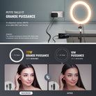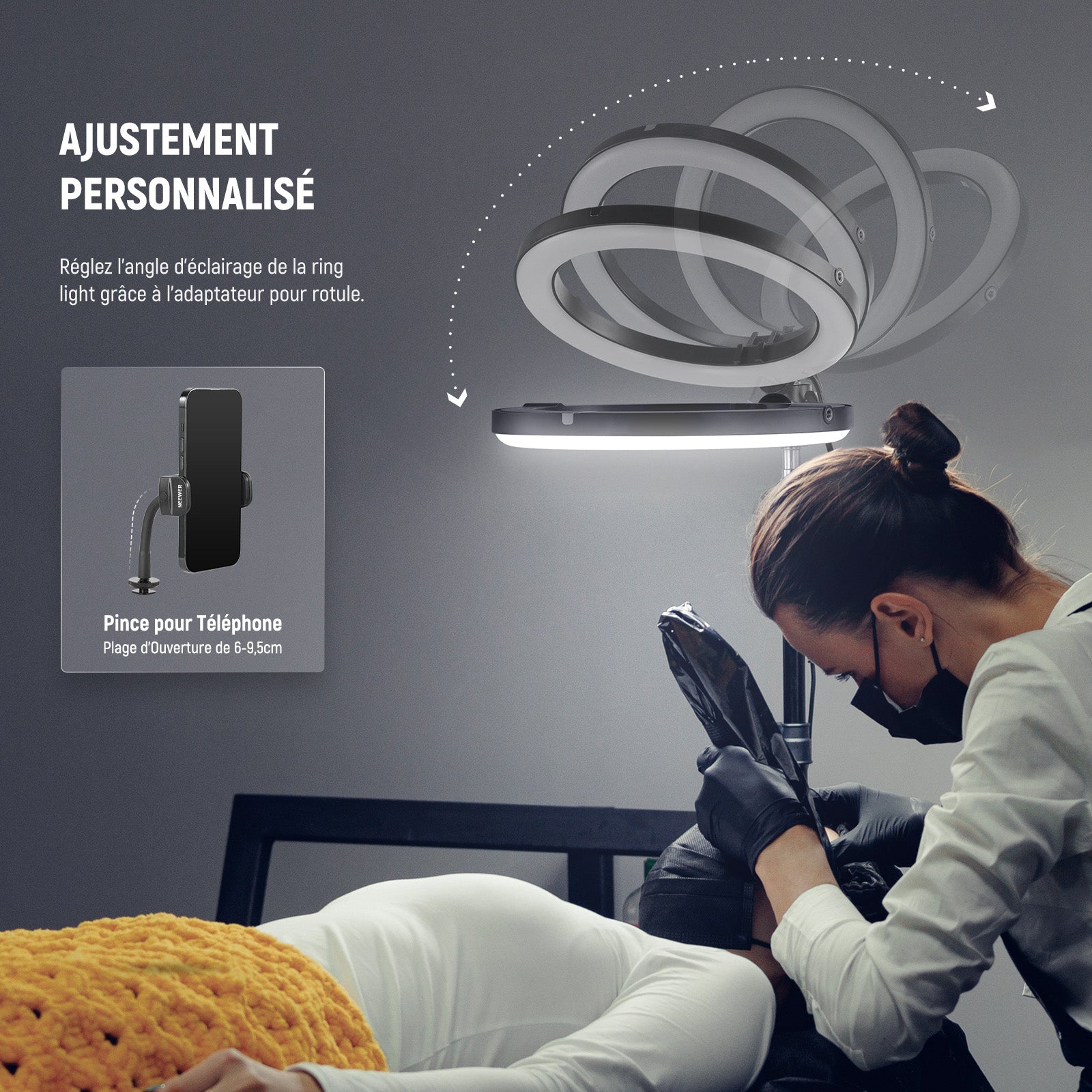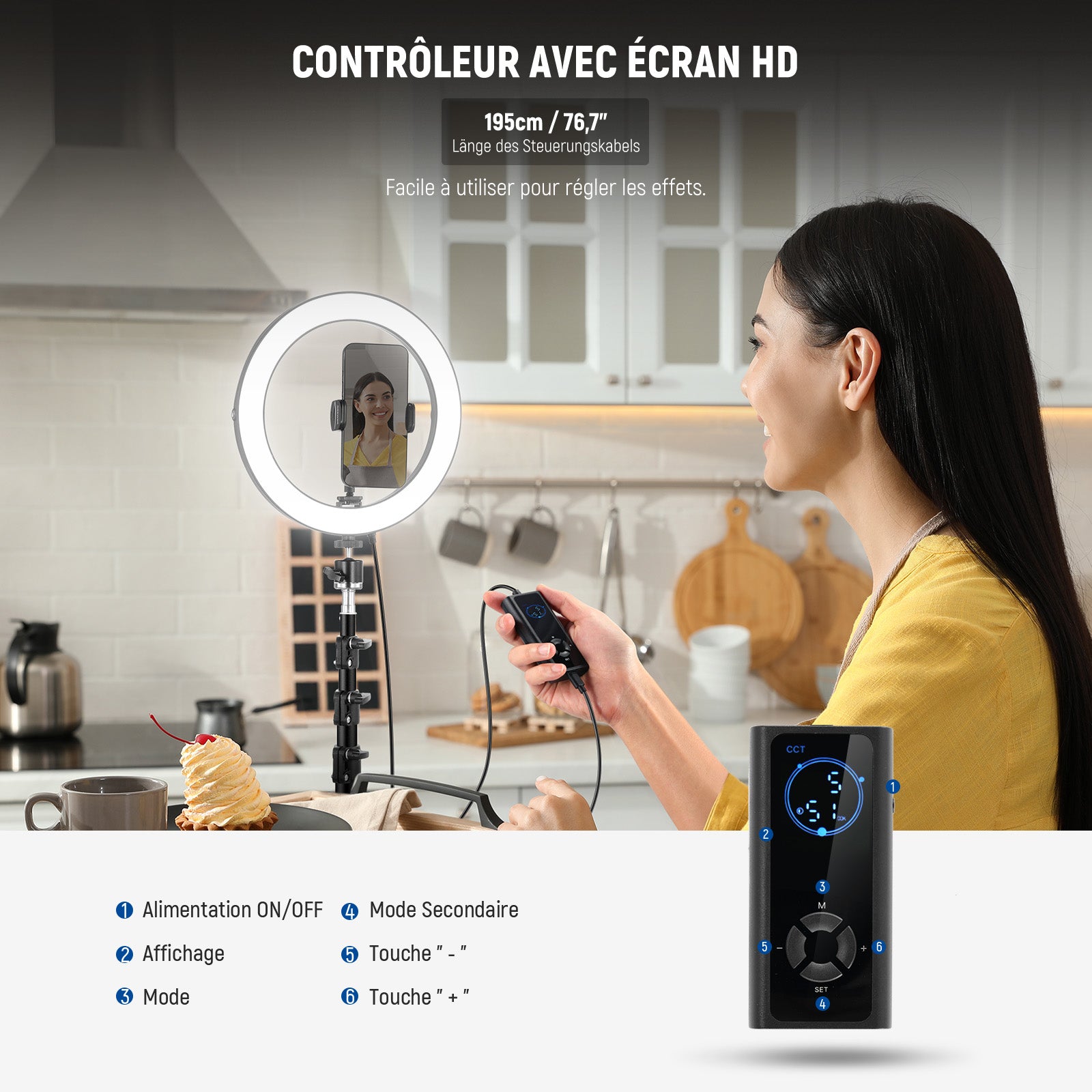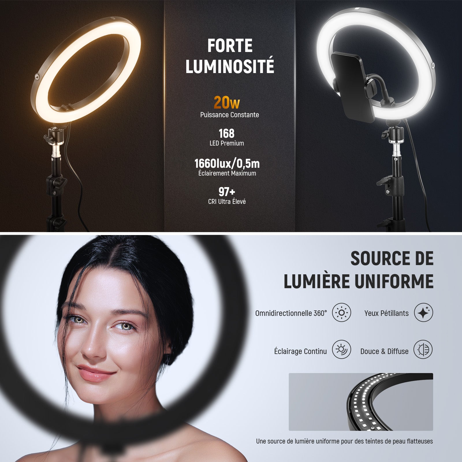 - 【Puissante Ring Light Bicolore 20W】 Une ring light puissante de 20W comme lumière principale ou d'appoint pour le maquillage, les esthéticiennes, le tatouage, l'enregistrement vidéo, le streaming, les appels Zoom, les photoshoot, les vlogs pour les réseaux sociaux ou TikTok. 168 LED (84 blanc froid et 84 blanc chaud), luminosité de 0 à 100%, éclairement de 1660LX/0,5m, et CRI 97+/TLCI 98+ produisent une source de lumière vive ou douce, diffuse et homogène avec une précision des couleurs parfaite