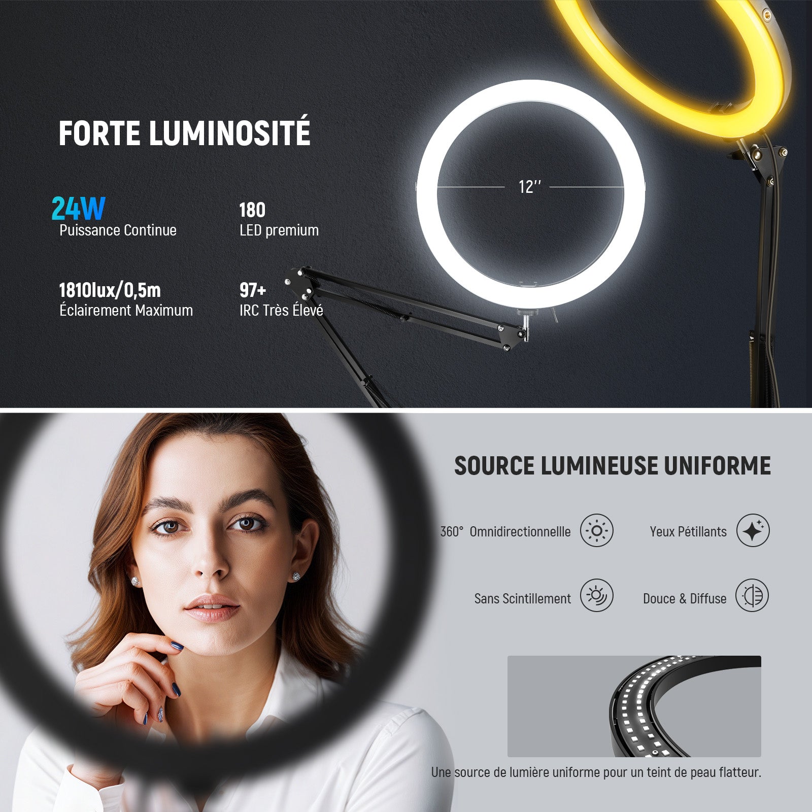 - 【Anneau lumineux bicolore puissant de 24W】 Ce kit d'éclairage principal ou d'appoint à haut rendement est idéal pour les appels Zoom, les réunions en ligne, l'enregistrement de vidéos YouTube, les selfies, le vlogging TikTok, les films de voyage, les podcasts. 180 LED (90 blanc froid, 90 blanc chaud) pour un éclairement de 1810 lux/0,5m. Éclairage continu lumineux, doux et uniforme, avec une grande précision des couleurs (IRC 97+ / TLCI 98+).