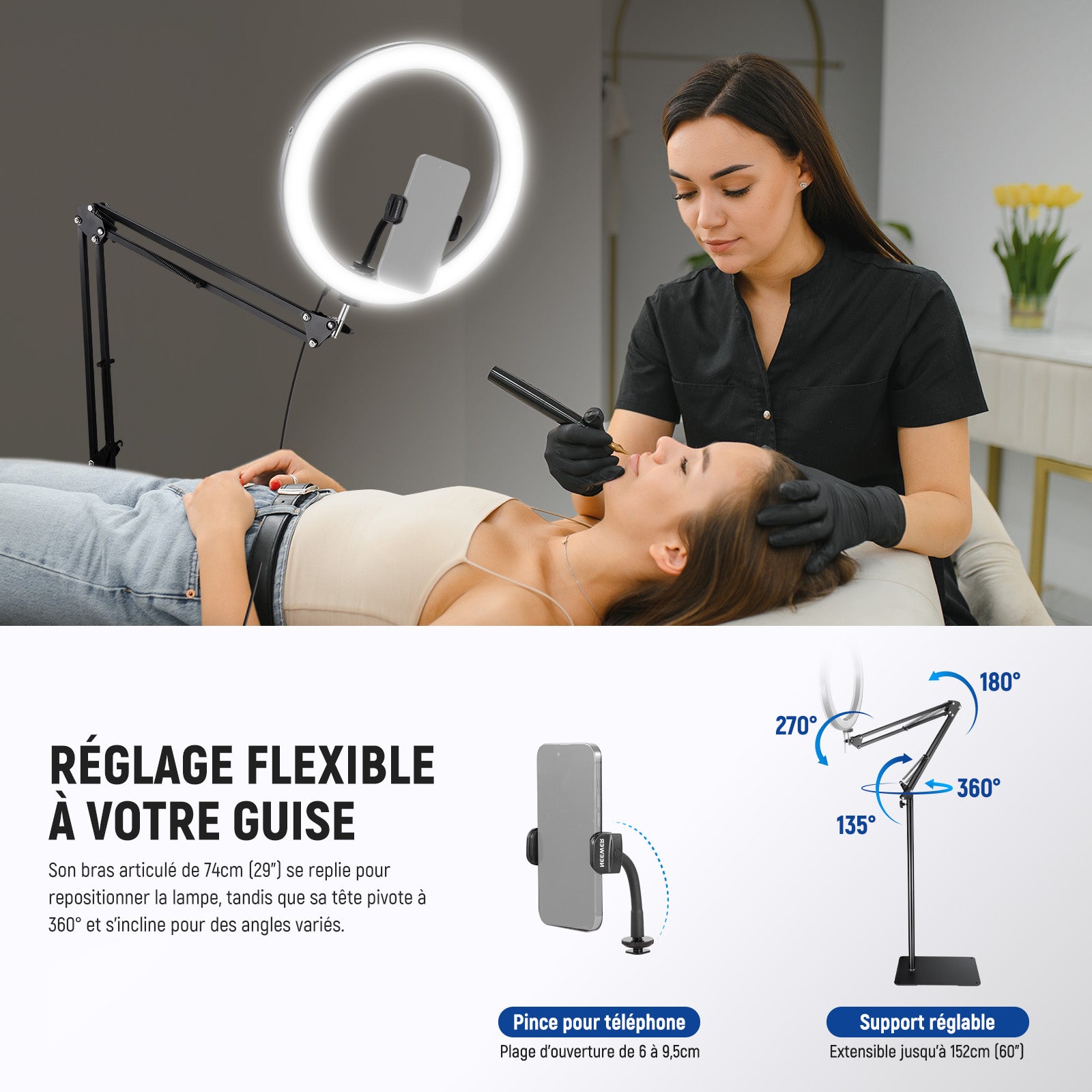 - 【Support réglable avec bras pliable】 Ce kit d'éclairage annulaire halo pour selfies comprend un support pliable extensible jusqu'à 152cm, vous permettant de l'installer et de le positionner au-dessus de votre tête ou à hauteur des yeux pour l'enregistrement vidéo avec votre téléphone. Son bras flexible de 74cm en deux parties se replie pour orienter la lumière dans différentes directions, tandis que la tête d'éclairage pivote et s'incline à 360° pour des angles d'éclairage polyvalents.