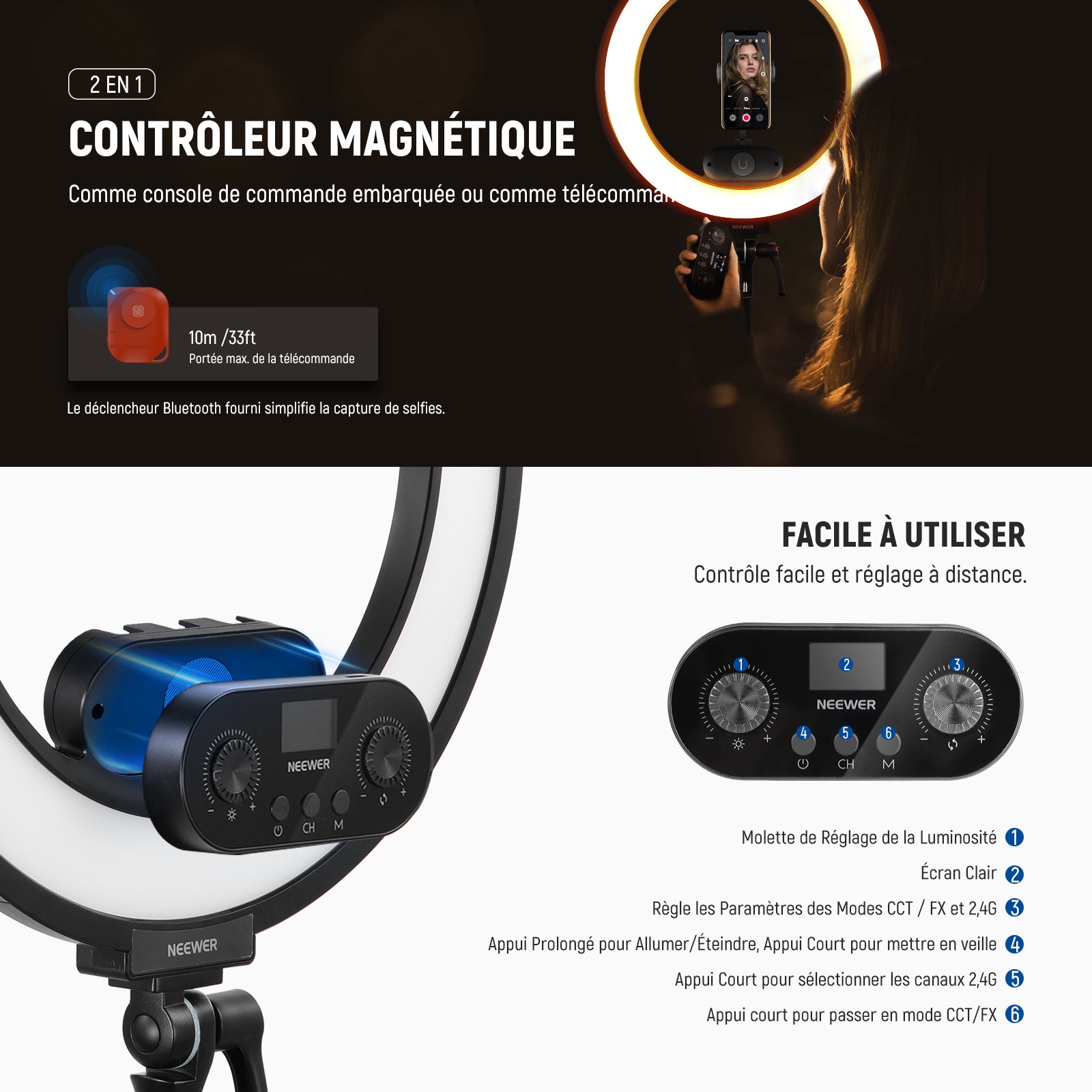 • 【Télécommande Magnétique 2 en 1】 La télécommande sans fil facilite l'utilisation de l'éclairage. Elle peut servir de panneau de contrôle lorsqu'elle est fixée à la partie magnétique du RL45B ou de télécommande lorsqu'elle est détachée. Utilisez-la pour régler la luminosité et la température de couleur, sélectionner les canaux, les modes d'éclairage et allumer ou éteindre la lumière. Elle peut également être rechargé directement sur la partie magnétique ou avec un câble USB-C (non fourni).