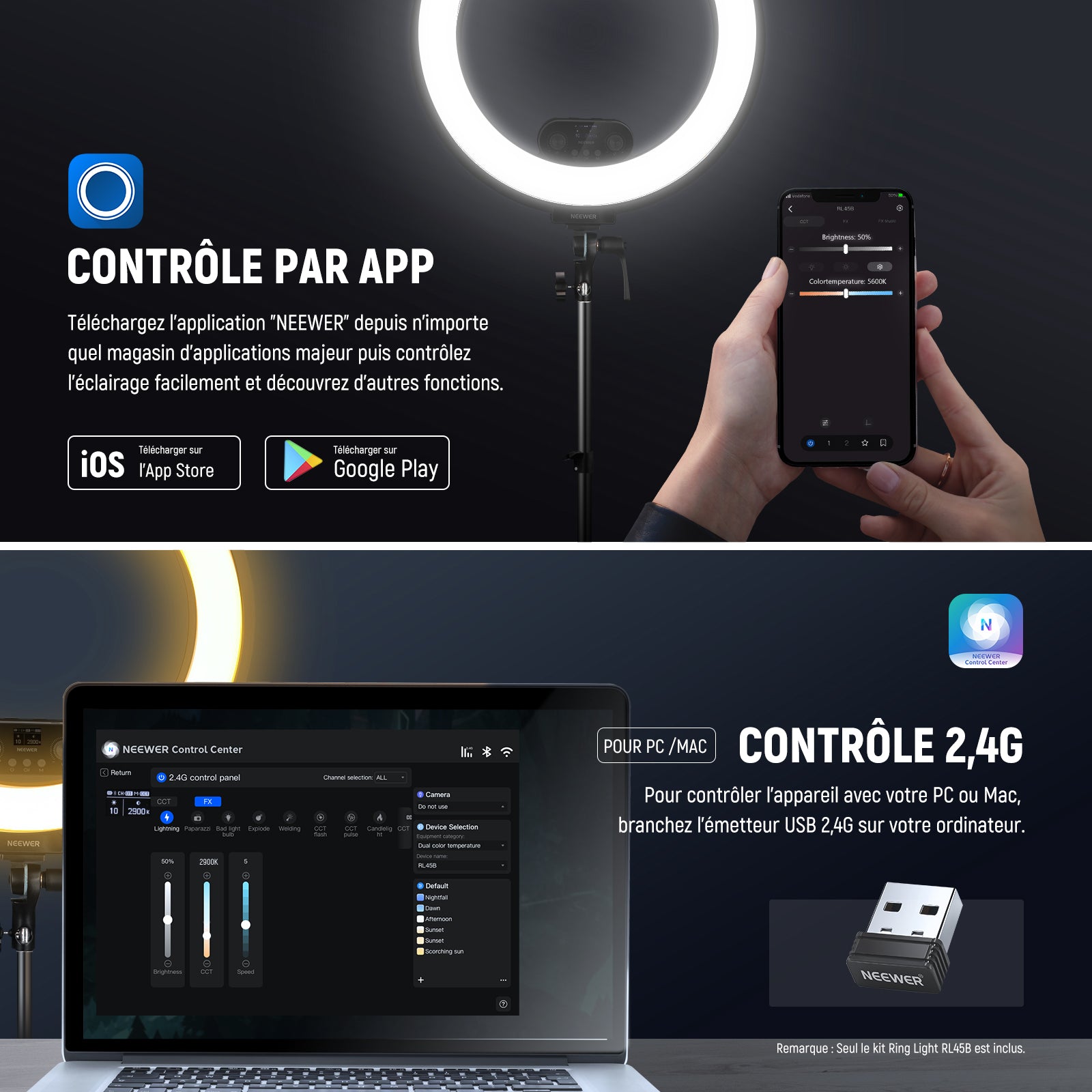 • 【Contrôle APP/2,4G pour PC & Mac】 Téléchargez l'application "NEEWER" depuis n'importe quel magasin d'applications majeur, appairez votre smartphone avec le RL45B en Bluetooth dans l'application et ainsi contrôlez l'éclairage. Contrôlez l'éclairage avec votre PC/Mac en branchant le transmetteur USB 2,4G à votre ordinateur et téléchargez le logiciel " NEEWER Control Center ". Réglez le RL45B et le logiciel sur le même canal pour contrôler facilement l'éclairage.