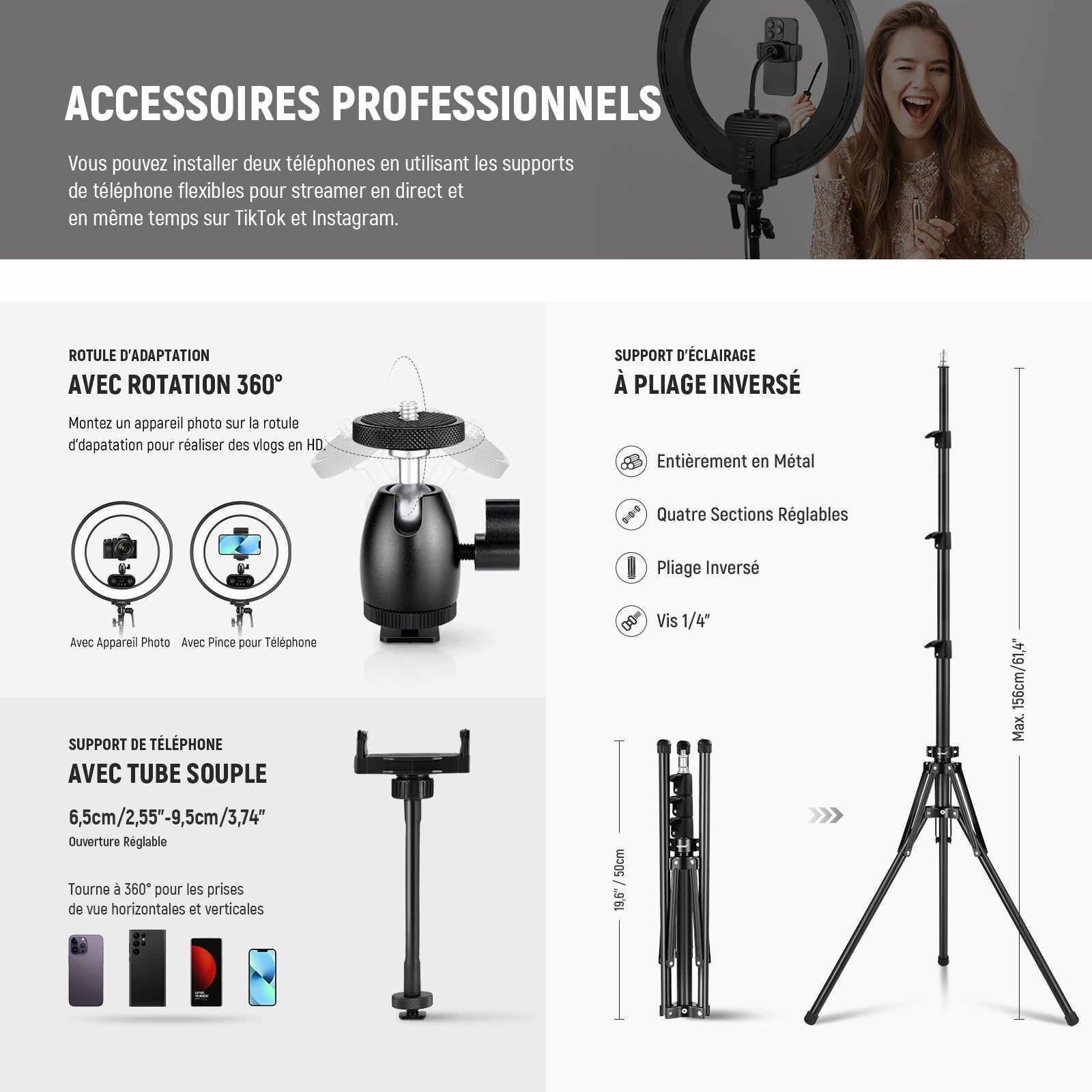 • 【Support pour Téléphone ou Rotule】 RL45B est équipé de trois fixations de type cold shoe. Installez deux téléphone grâce aux supports pour téléphone pour streamer en direct et simultanément sur TikTok et Instagram ou un appareil photo sur rotule pour réaliser des vlog en HD. Le déclencheur Bluetooth vous permet de faire des photo vidéo d'un seul clic avec téléphone. Compatible avec iPhone 16 15 Pro Max 14 13 Plus Mini 12 Samsung Galaxy S24 S23 S22 Ultra Google Pixel 9 8 7 Pro, etc… Sac inclus.
