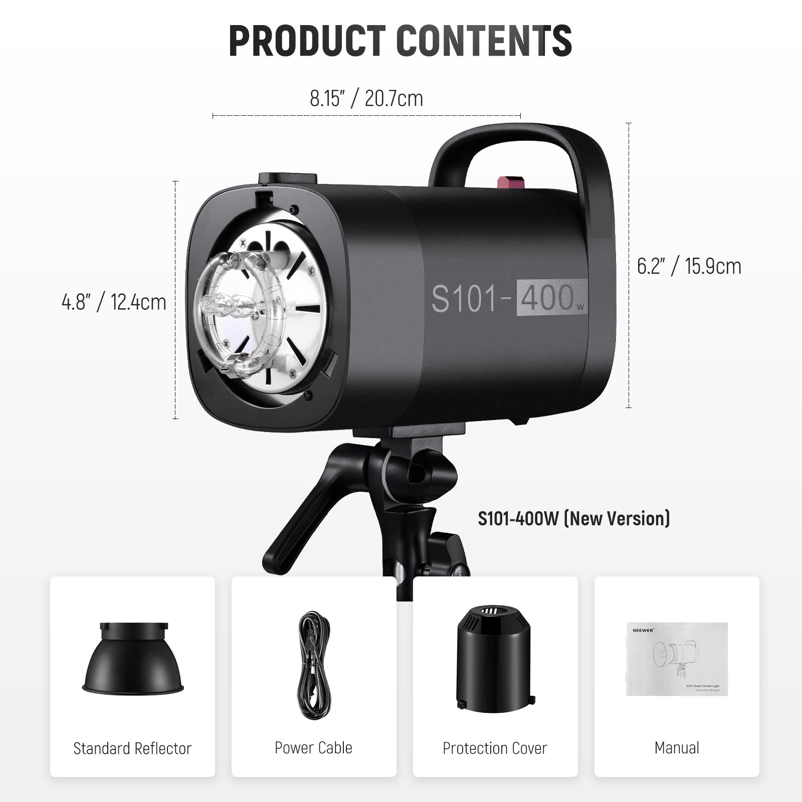- 【Monolight puissant de 400Ws】 NEEWER S101-400W est un flash monolight de studio professionnel avec une puissance maximale de 400Ws, une température de couleur constante de 5600K, un nombre guide élevé GN65 (1m, ISO 100) pour des réglages flexibles de la distance du flash et de l'ouverture, idéal pour les produits, les portraits et les photos. photographie de vie, culinaire, commerciale et de mariage