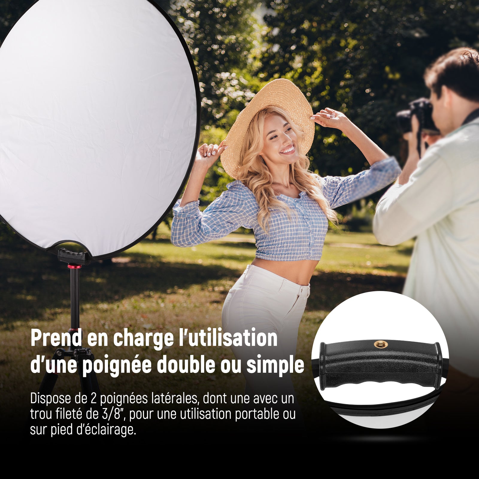 • 【Double poignées et filetage 3/8" 】 Avec les 2 poignées, vous pouvez librement positionner et ajuster le réflecteur pour obtenir l'éclairage le plus souhaitable pour les prises de vue. De plus, l'une des poignées est livrée avec un filetage 3/8", vous permettant de le monter sur un support d'éclairage ou un support en C pour libérer vos mains