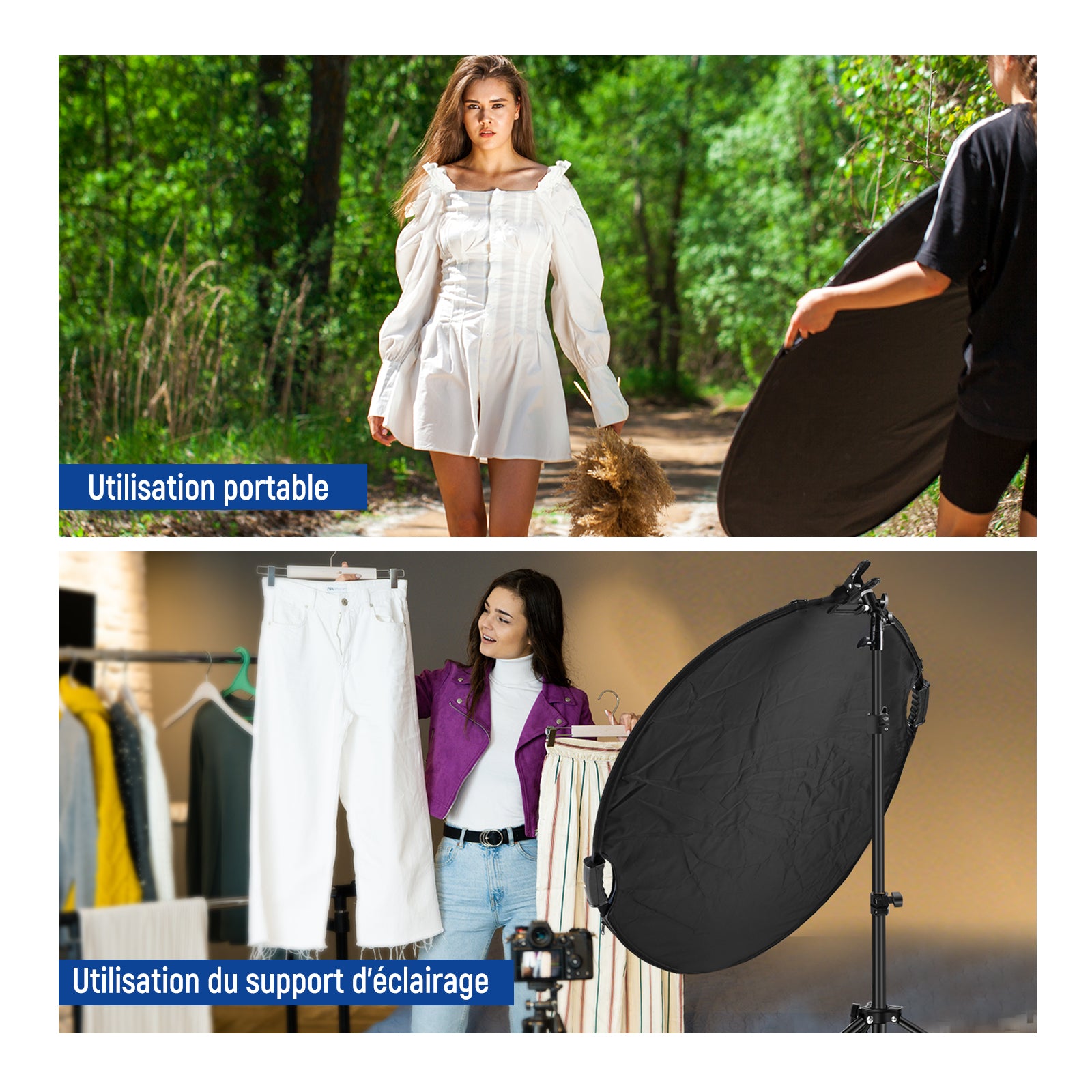 • 【Réflecteurs de photographie 5 en 1】 Ce kit de réflecteur de lumière 5 en 1 se compose d'un panneau diffuseur rond et translucide et d'un manchon réversible qui présente des surfaces blanches, noires, dorées et argentées. Au total, ce kit vous donnera 5 couleurs de surfaces réfléchissantes pour obtenir différents tons et effets pour une photographie efficace, adaptée à une utilisation en studio et en extérieur