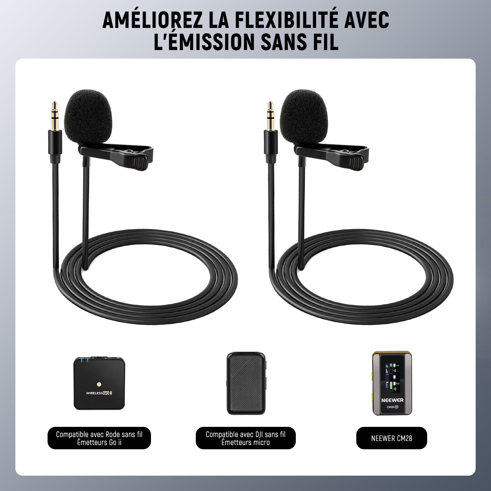 - 【Compatibilité universelle】 Compatible avec les smartphones, caméras, caméscopes et enregistreurs audio équipés d'une prise 3,5 mm TRS. Également compatible avec Rode Wireless GO II, les émetteurs DJI Wireless Mic et les systèmes de microphones sans fil NEEWER CM28/CM31.