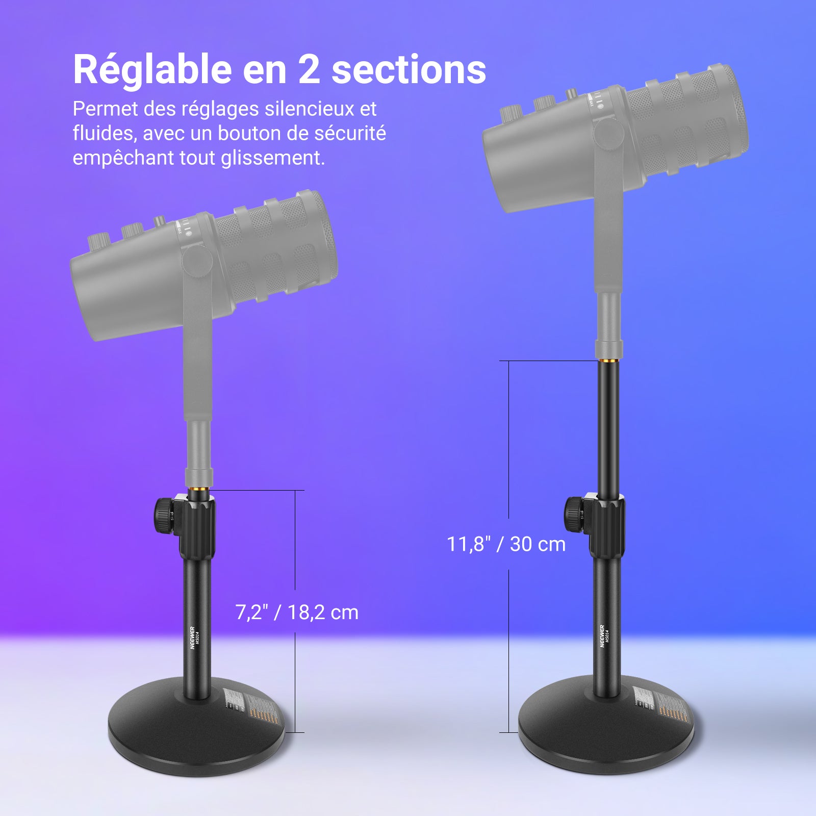 - 2 sections réglables : le support de micro court s'ajuste en hauteur de 18,2 à 30 cm, permettant des ajustements silencieux et sans couture, avec un bouton sécurisé pour éviter de glisser