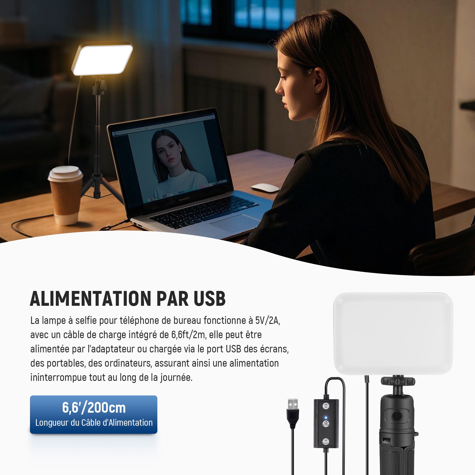 • 【Alimentation USB】Cette lampe selfie de bureau fonctionne à 5V/2A et est équipée d'un câble de charge intégré de 2m. Elle est alimentée par l'adaptateur secteur ou par des écrans USB, des ordinateurs ou des chargeurs portables. Une fois connecté, un voyant LED bleu s'allume. Appuyez sur le bouton d'alimentation pour allumer/éteindre la lumière.