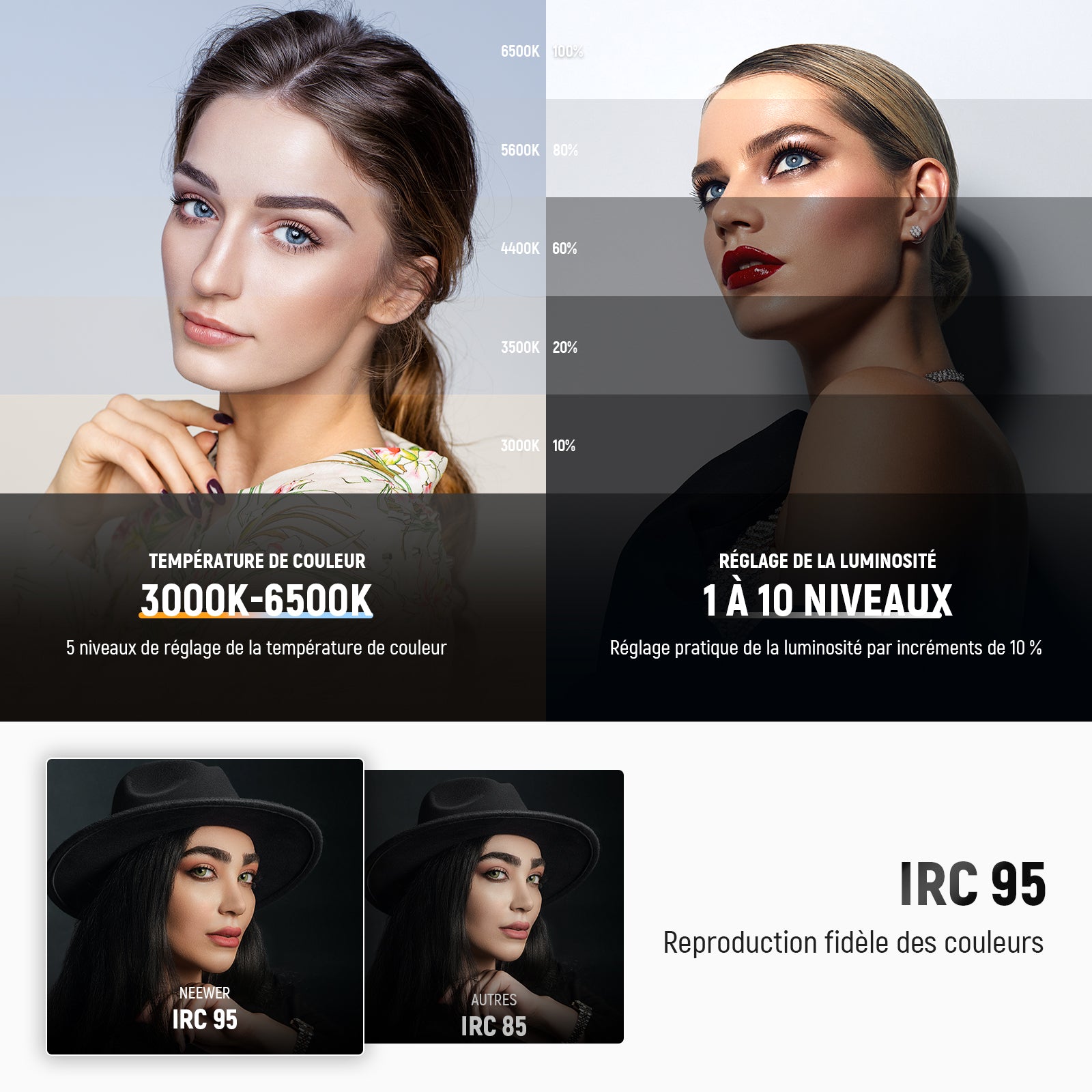 - Réglage de la température de couleur : 3000 K - 3500 K - 4400 K - 5600 K - 6500 K