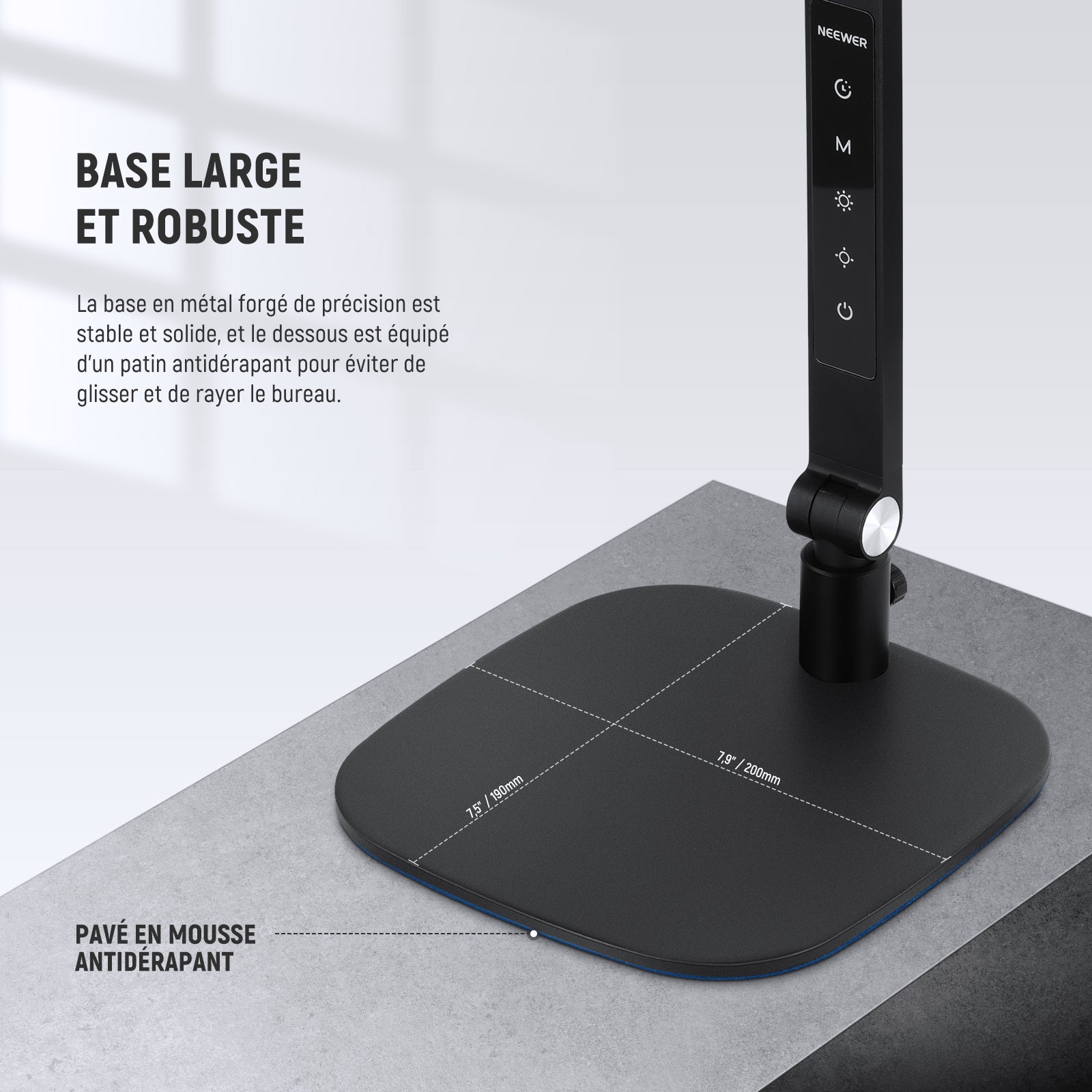 - Dimensions de la base : 190 x 200 x 7 mm / 7,5" x 7,9" x 0,3"