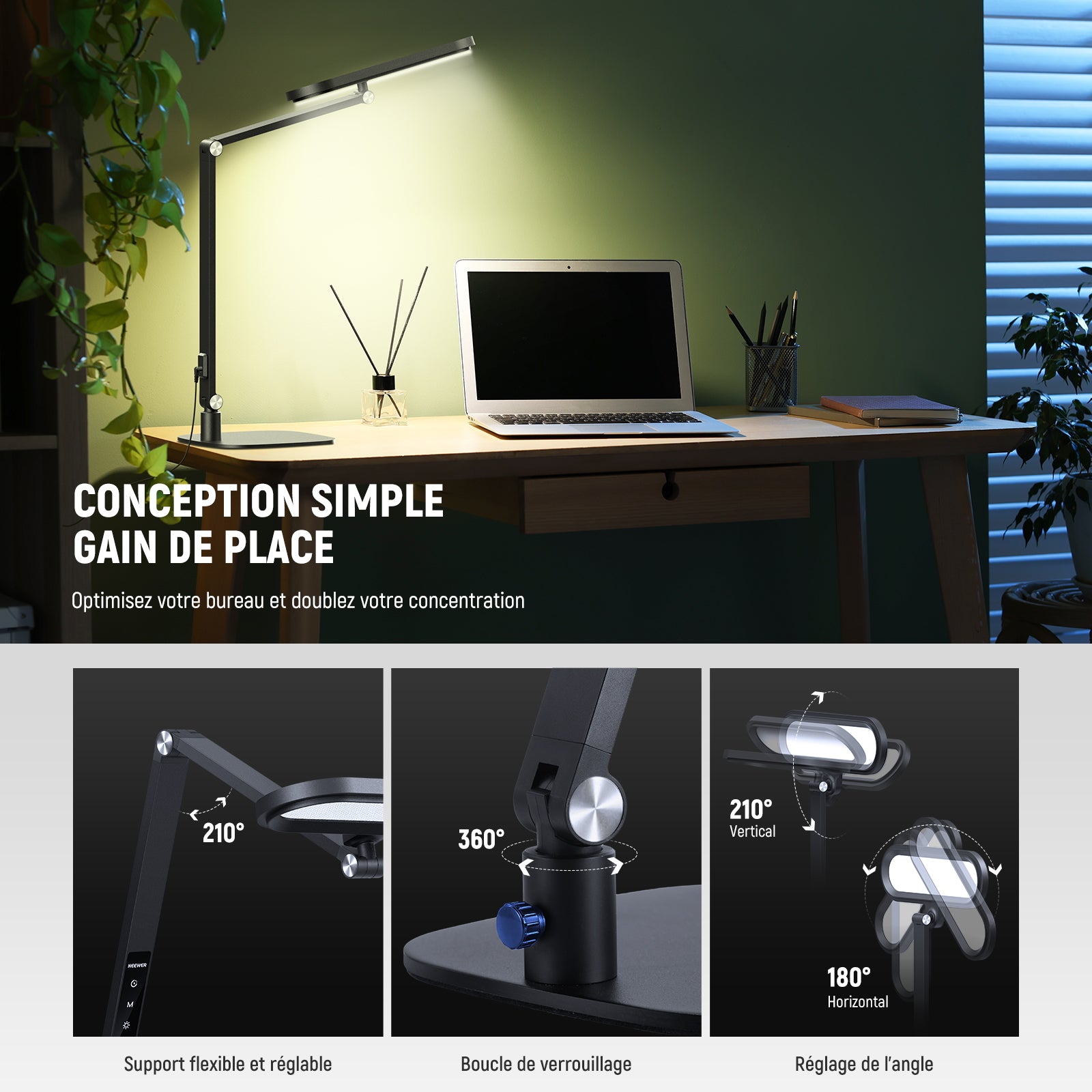 - 【Pliable avec hauteur et angle réglables】Cette lampe LED de table est dotée d'un bras articulé pliable à 180° et d'une tête orientable permettant d'orienter la lumière de haut en bas et de gauche à droite. La hauteur totale est 80cm,ajustable grâce à 2 articulations supérieures.Lampe portable idéale pour un éclairage principal ou d'appoint sur votre bureau.Parfaite pour YouTube TikTok selfie vidéo streaming maquillage appel/réunion Zoom podcasts photographie vidéographie tournage.