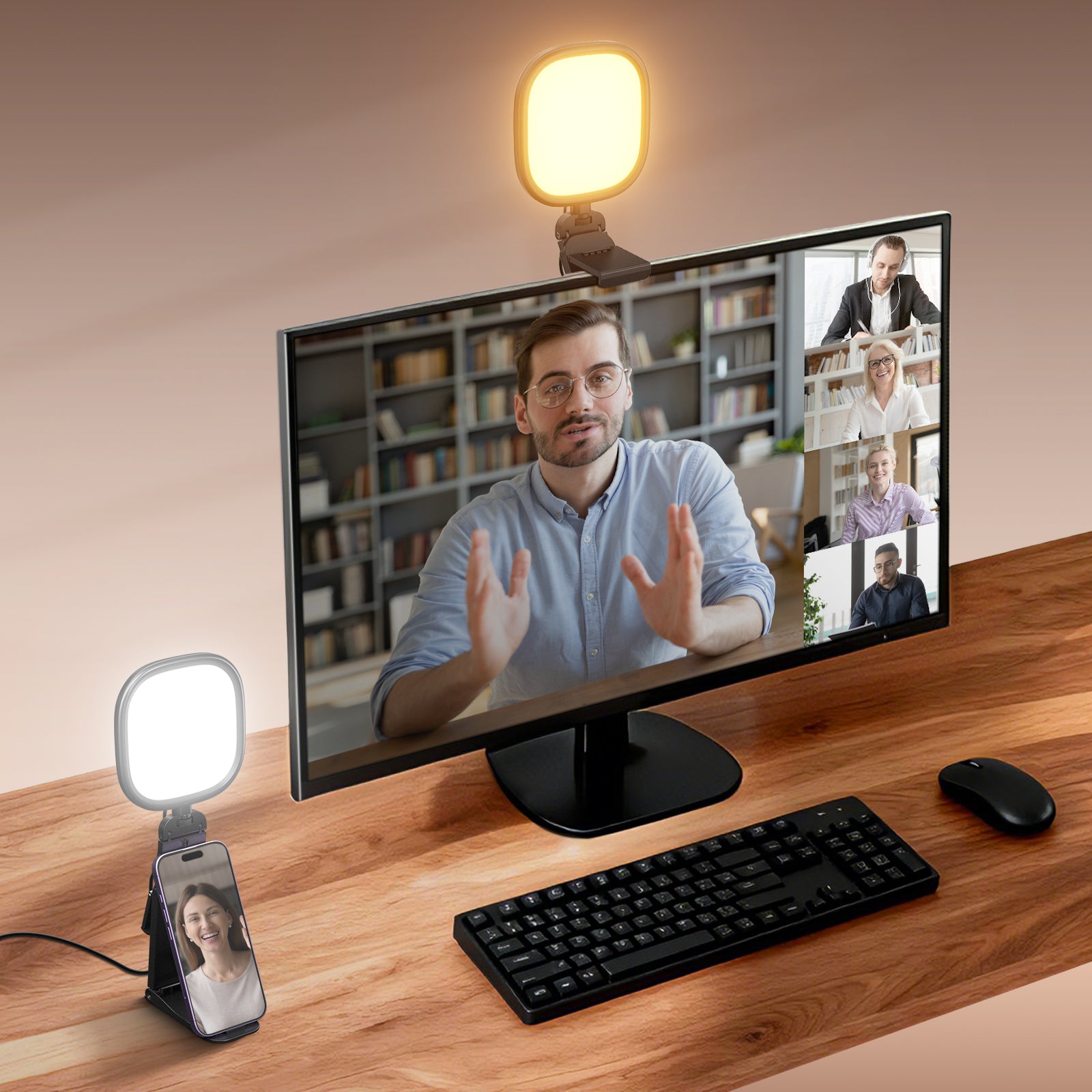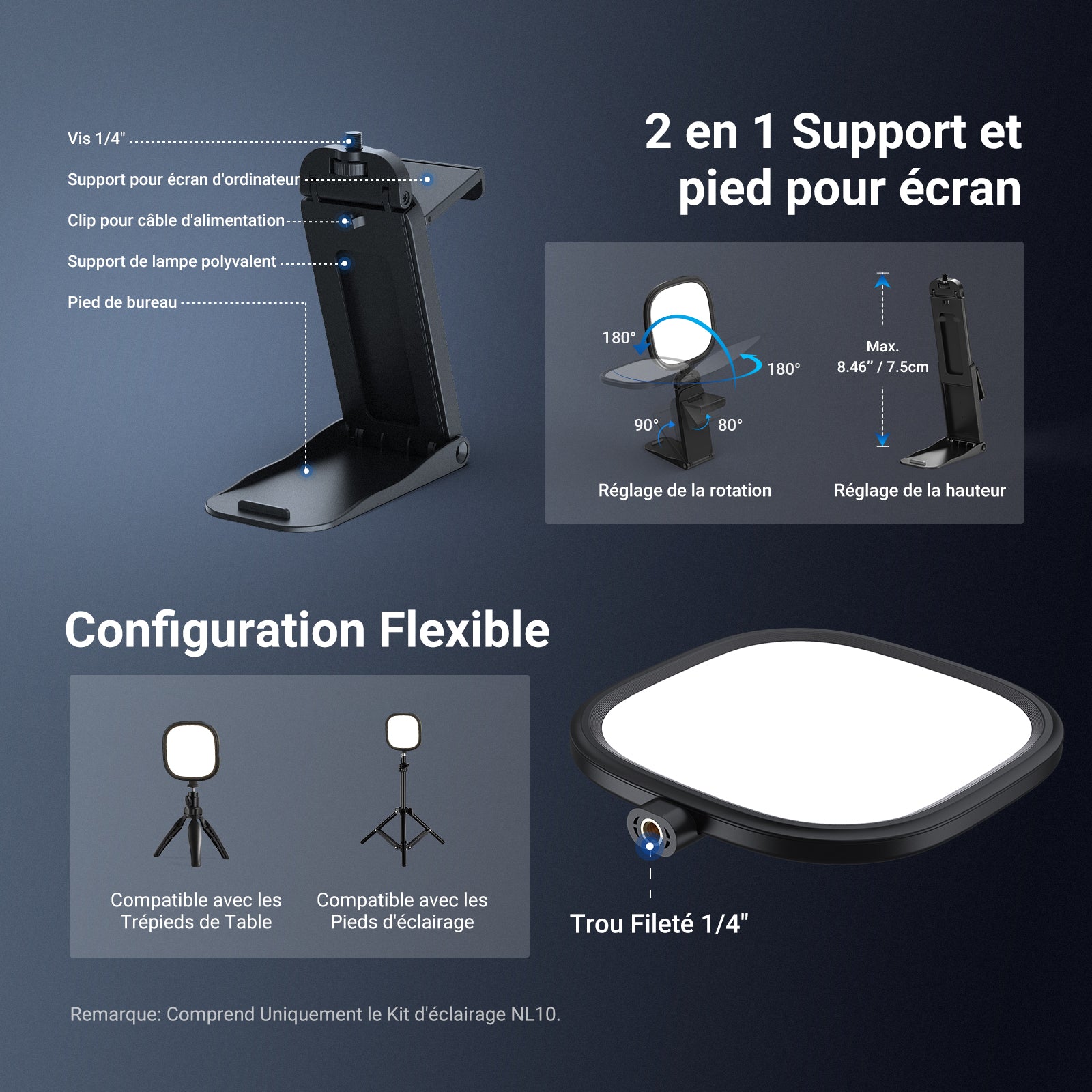 - 【Support d'éclairage multifonctionnel et hauteur/angle réglables】 Le support amovible avec vis 1/4" permet de fixer la lampe pour webcam au dessus d'un écran, avec 4 niveaux de hauteur réglables. Il peut également servir de mini support de bureau pour la lampe et un smartphone, pour la photographie/vidéographie avec l'appareil photo de votre téléphone. La tête d'éclairage s'incline à 180° d'avant en arrière et pivote à 360° horizontalement de gauche à droite