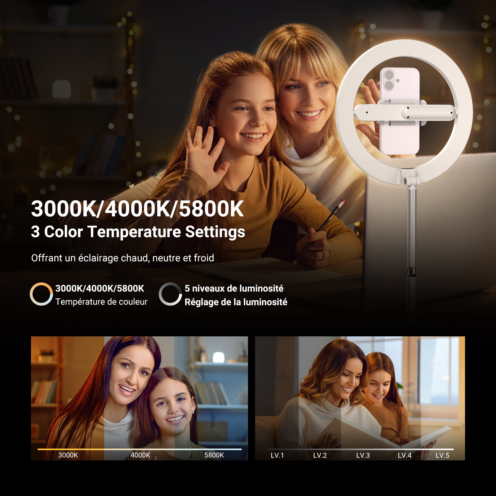- 【3 modes de couleur et 5 niveaux de luminosité】 Dotée de 144 LED à lumière chaude et froide,cette lampe annulaire/ringlight offre une luminosité jusqu'à 830 lux à 0,5m avec CRI de 85+,proposant un éclairage chaud,neutre & froid avec 5 niveaux de luminosité pour sublimer différentes carnations.Éclairage doux et uniforme pour sublimer regard et atténuer ombre marquée.Idéal comme lumière principale ou d'appoint pour vidéos,maquillage,podcasts,diffusions en direct,photographie et vidéographie,selfie