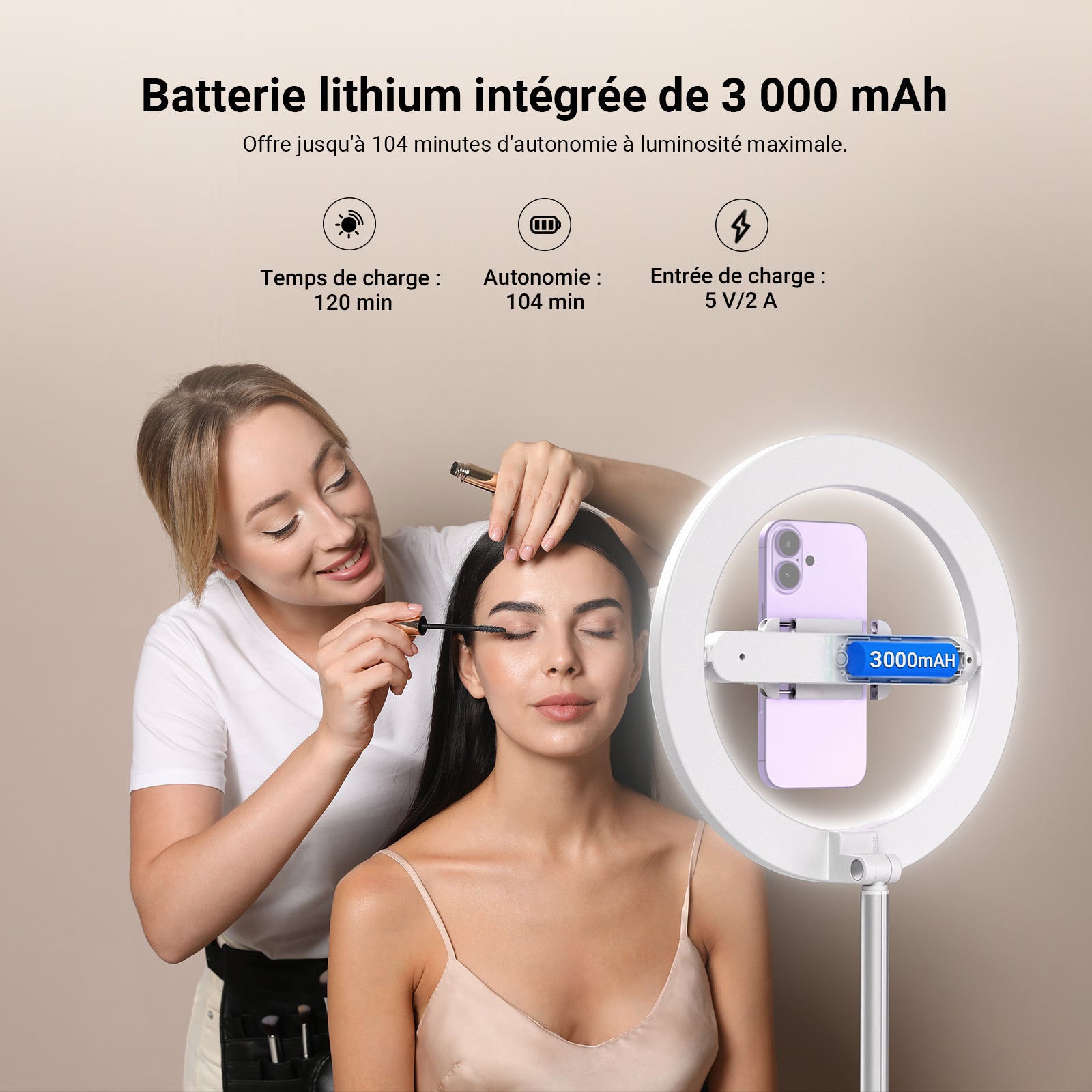 - 【Batterie intégrée de 3000mAh et alimentation USB】 Équipée d'une batterie rechargeable intégrée de 3000mAh, cette lampe annulaire portable est idéale pour les selfies sur téléphone et ordinateur. Offrant jusqu'à 104 minutes d'autonomie à pleine luminosité, cette lampe annulaire élimine les contraintes des câbles d'alimentation, contrairement aux modèles traditionnels alimentés par adaptateur. Elle est également compatible avec une alimentation USB 5V/2A ou 5V/1A pour un éclairage continu
