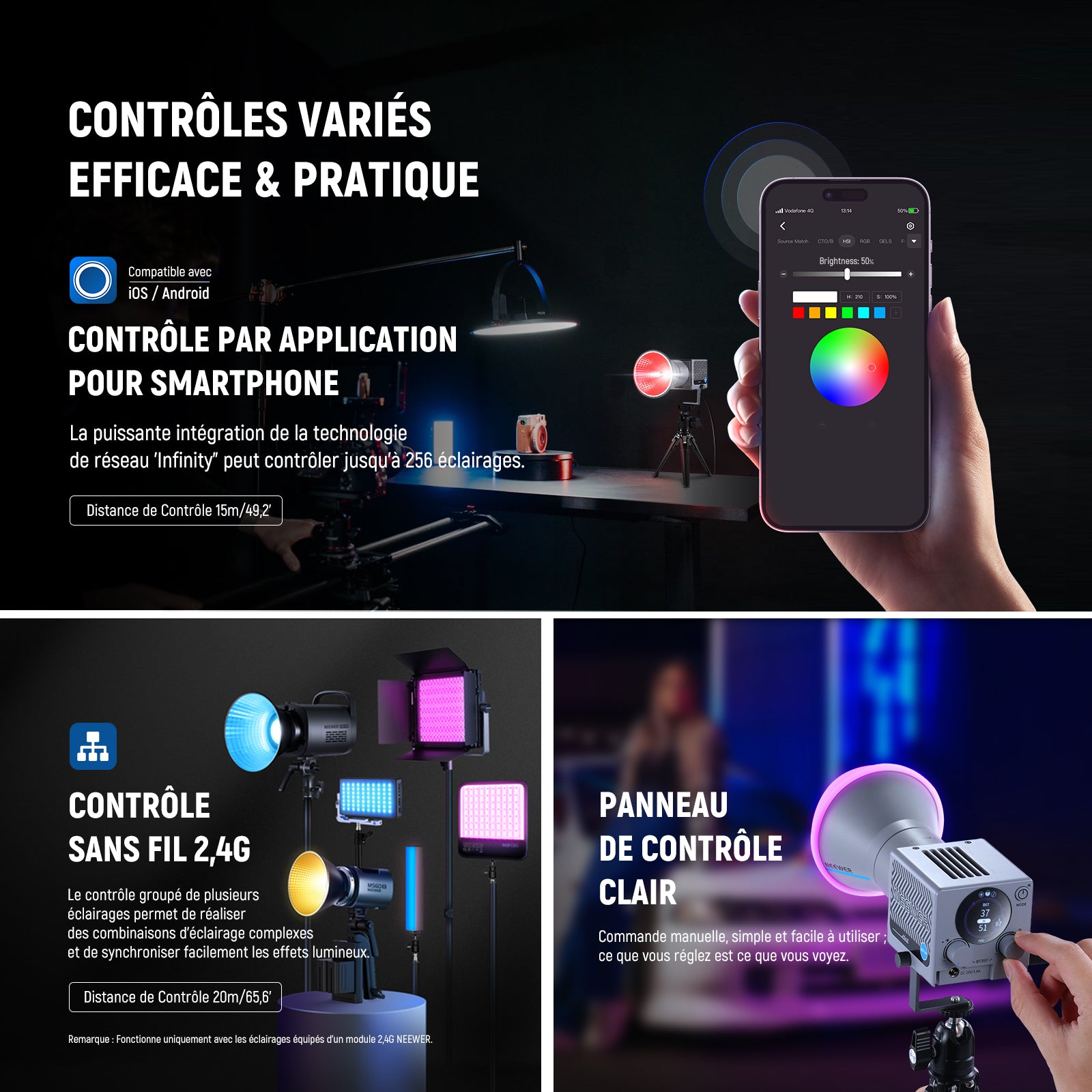 - 【Contrôle APP/2,4G/Embarqué】 Téléchargez l'APP NEEWER et utilisez la technologie infinity pour contrôler jusqu'à 256 éclairages dans un rayon de 15m, ajustez les paramètres sans fil et activez les mises à jour OTA. Le système 2,4G intégré permet de gérer des groupes d'éclairage en synchronisant le contr?le de plusieurs éclairages NEEWER dans un rayon de 20m. Vous pouvez également modifier les fonctions/réglages principaux avec les boutons physiques situés sur le corps de l'appareil