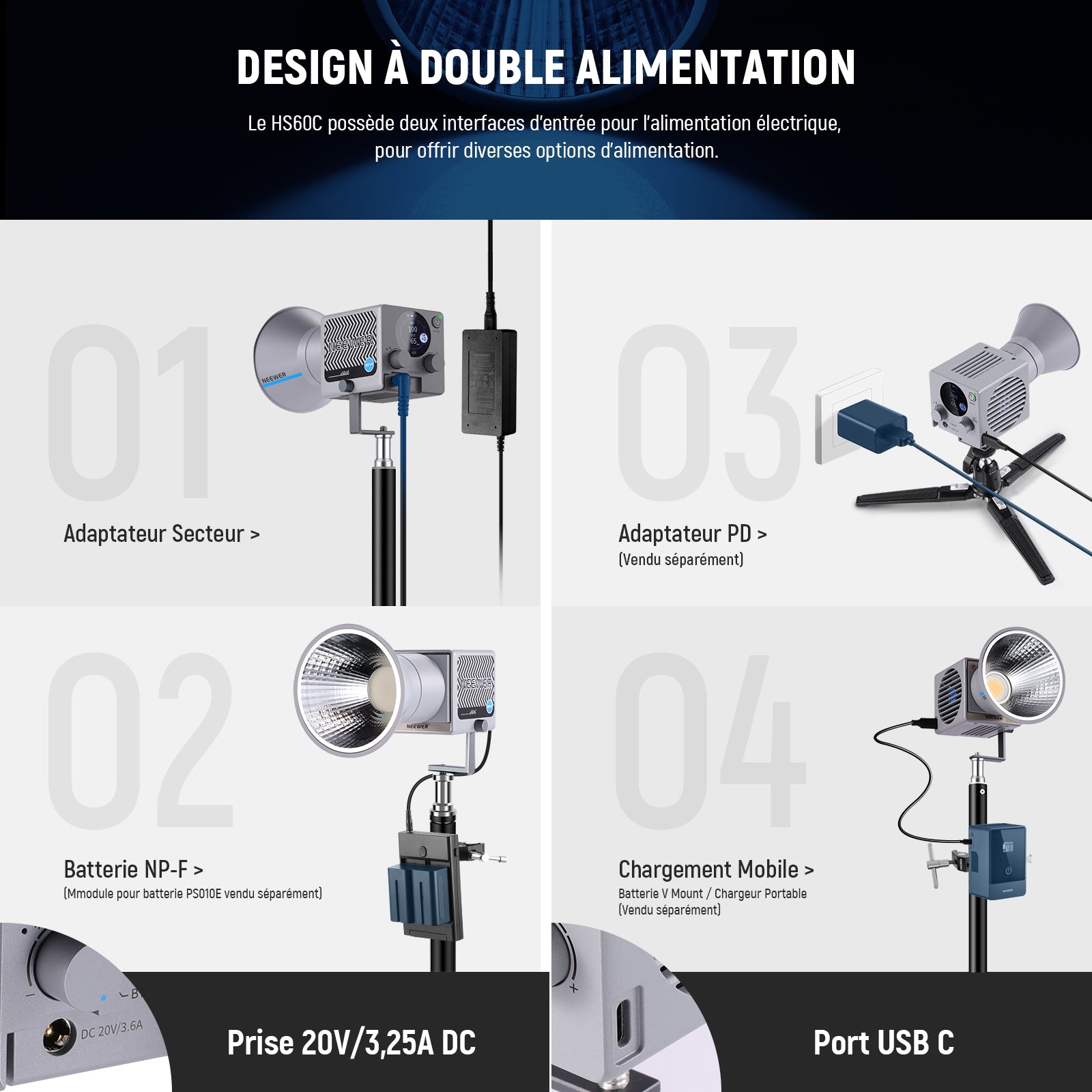 - 【Deux Options d'Alimentation】 Les ports 20V/3,25A DC & USB C intégrés à la lampe LED COB fournissent de bonnes solutions d'alimentation. Pour plus de souplesse en extérieur, utilisez des batteries V Mount, des plaques pour batterie NP-F ou des chargeurs portables (tous vendus séparément). Pour des prises de vue plus longues en intérieur, utilisez l'adaptateur secteur fourni ou l'adaptateur PD (NON fourni). La puissance supportée pour la charge rapide PD est comprise entre 10W et 65W