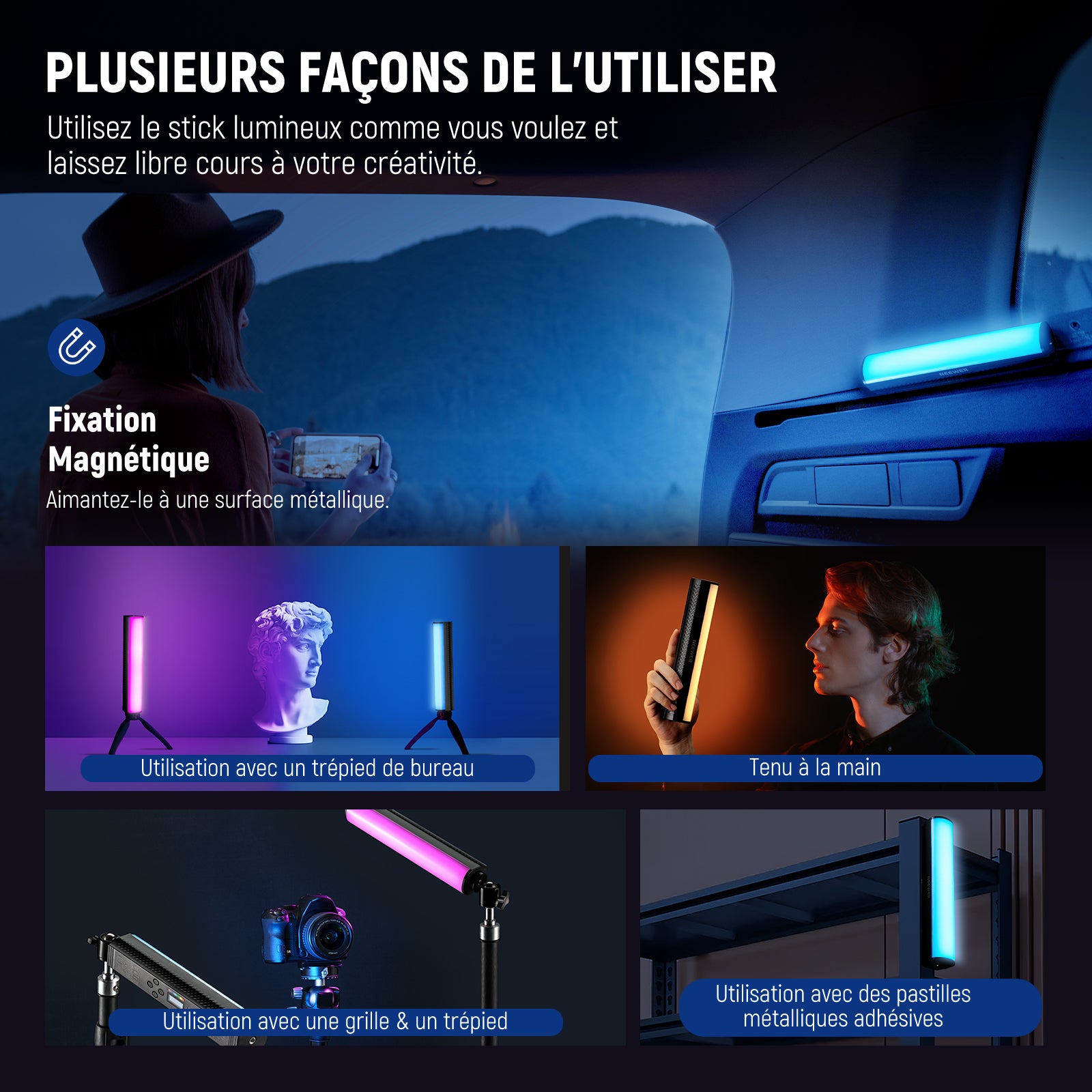 Attachement Magnétique et Trous de montage 1/4"- Avec des trous de vis filetés 1/4" aux deux extrémités, le bâton lumineux à main peut également être monté sur un trépied ou un support de bureau pour différents angles d'éclairage. Vous pouvez fixer ses côtés magnétiques à n'importe quelle surface métallique pour la prise de vue en hauteur, en contre-plongée ou en plongée. Vous pouvez également tenir le bâton lumineux à portée de main dans un KTV ou lors d'un concert pour créer une atmosphère.