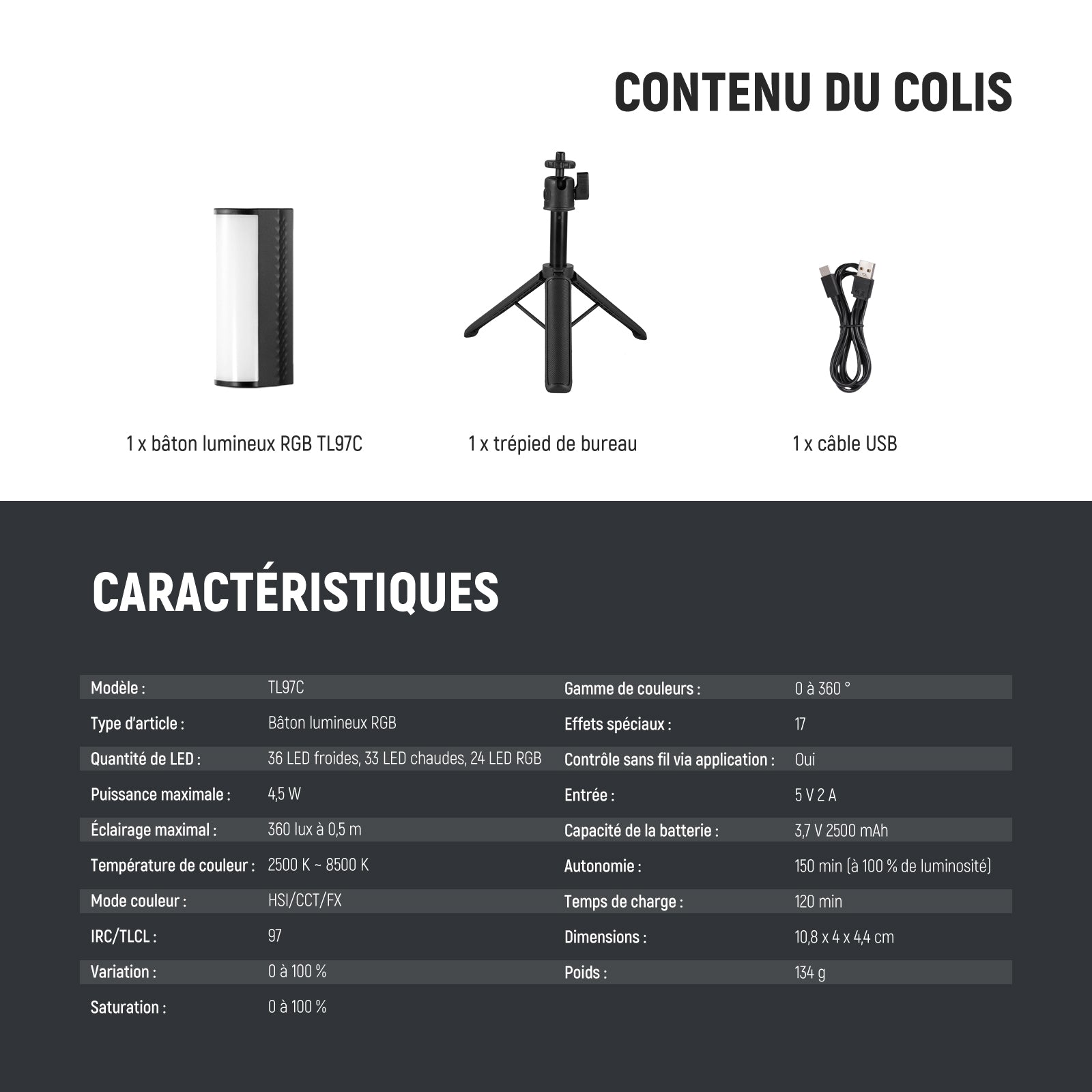 - 【Batterie Rechargeable 2500mAh】 Avec une batterie 3,7V rechargeable de 2500mAh, une autonomie d’éclairage continu à 100% de luminosité pendant 150 minutes et la possibilité de l'utiliser tout en chargeant. Complètement chargée en seulement 120 minutes via le port de type C 5 V 2 A, ce stick semble parfait pour les créateurs de contenu et les influenceurs qui ont besoin d'un éclairage constant. Très pratique pour des séances de tournage prolongées et sans interruptions!