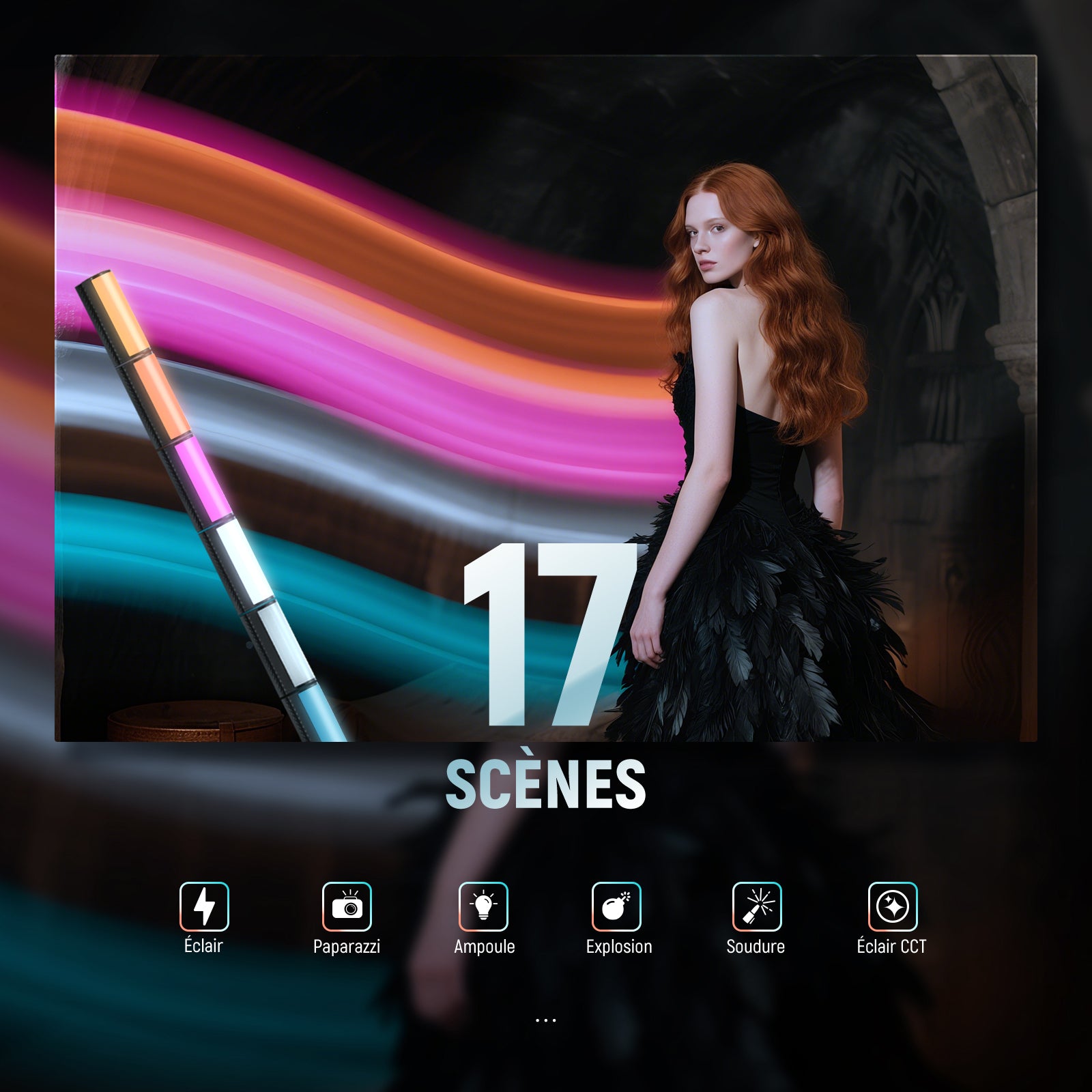 - 【Éclairage Créatif avec Modes CCT/HSI/FX】 Ce stick LED a des réglages précis pour des scènes d’éclairage personnalisées. Le mode CCT permet d’ajuster la température de couleur de 2500K à 8500K avec une correction GM intégrée. Le mode HSI permet un réglage fin de la roue chromatique sur 360°, de la saturation (0-100%) et de la luminosité (0-100%). Le mode FX propose 17 effets spéciaux (gyrophare, orage, feux d’artifice, etc.). L'écran OLED et les boutons physiques pour une utilisation intuitive.