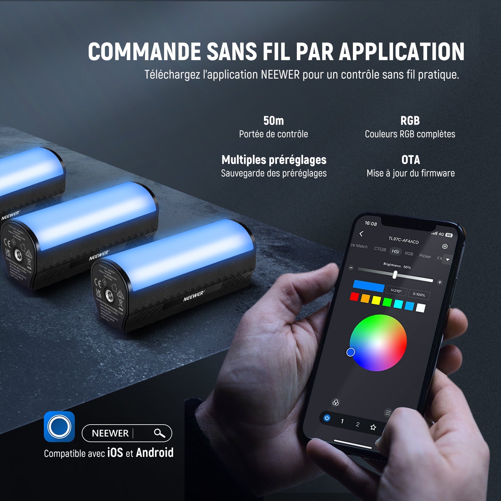 - 【Contrôle Sans Fil via l’Appli】 L’application "NEEWER" permet un contrôle sans fil du stick LED RGB jusqu’à 50m. Ajustez les niveaux de luminosité, température de couleur (CCT), roue chromatique et saturation, et sélectionnez des scènes personnalisées. L’application intègre une roue chromatique RGB pour choisir une couleur en glissant votre doigt sur le disque qui s’affiche. L’appli supporte des mises à jour OTA pour accéder aux nouvelles fonctionnalités.