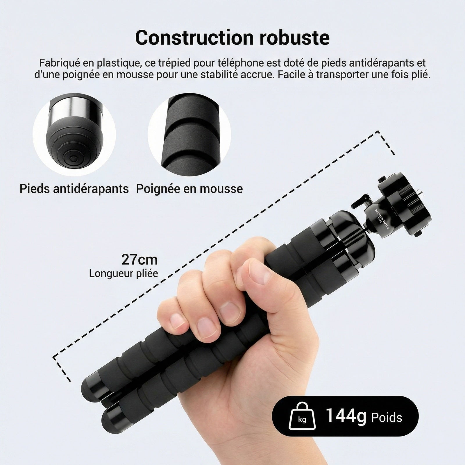 - 【Robuste et portable】 Fabriqué en plastique haute résistance, ce trépied pour téléphone portable est équipé de pieds antidérapants et d'une poignée en mousse pour une stabilité accrue. Pliable, il ne mesure que 27cm (10,6'') et se transporte facilement