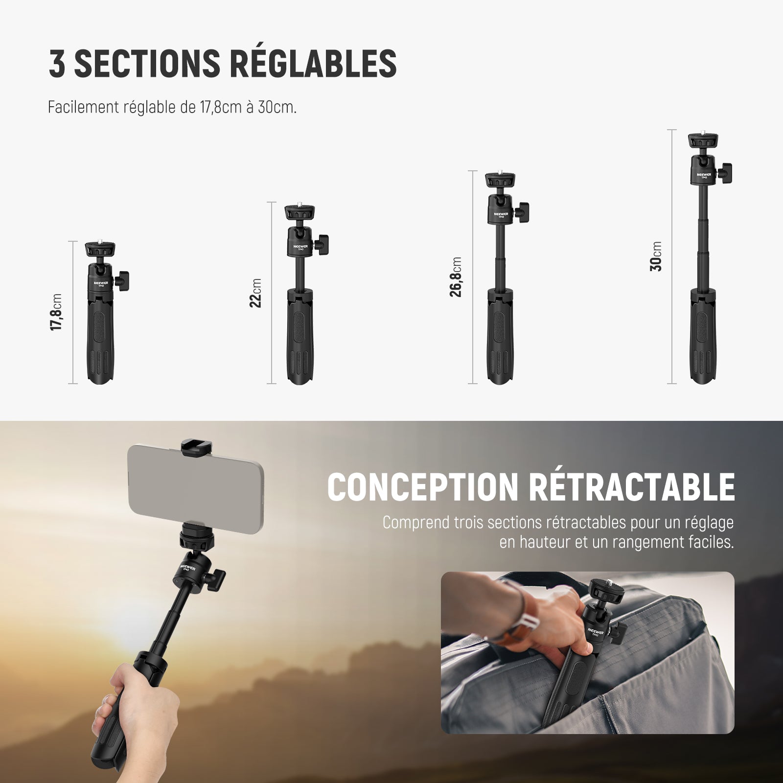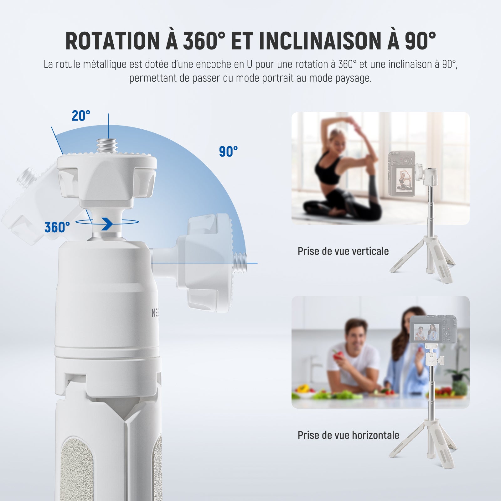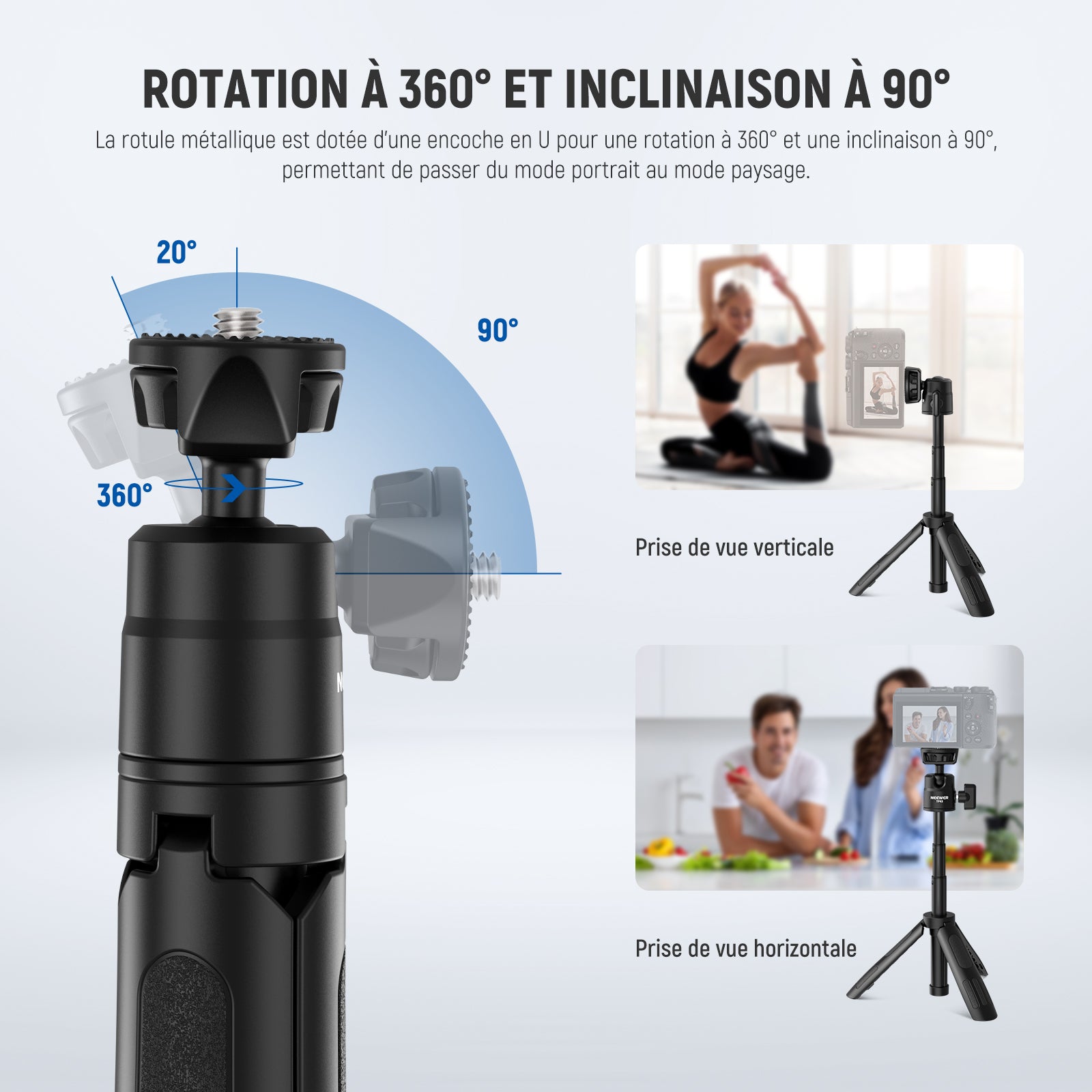 - Caractéristiques principales : Tête rotule à 360° et design trépied