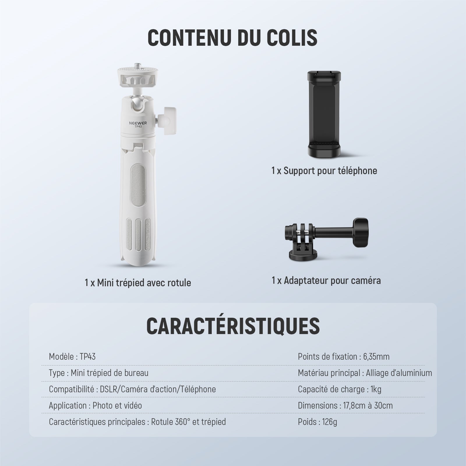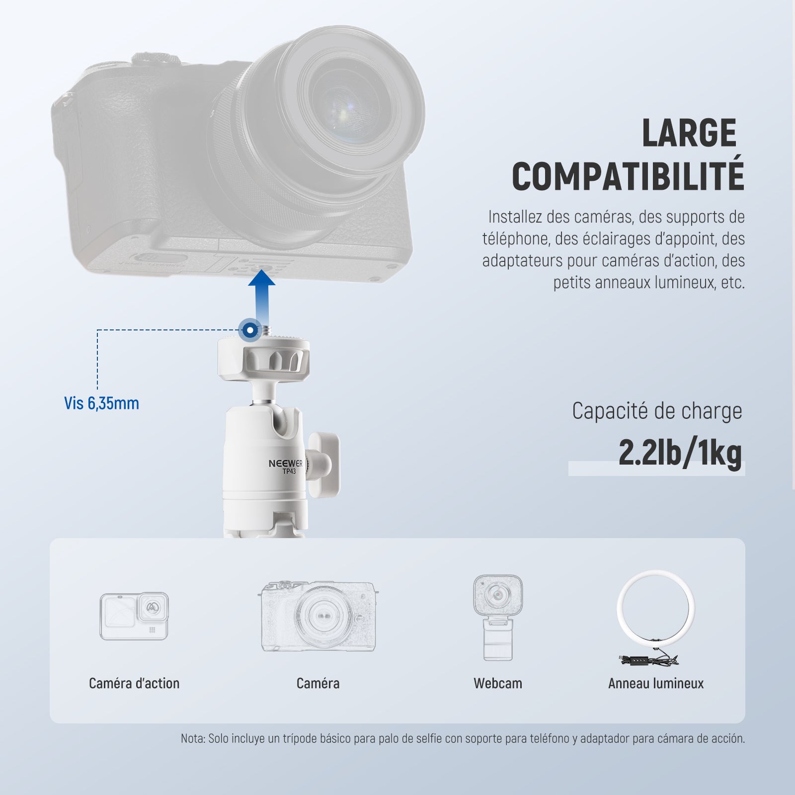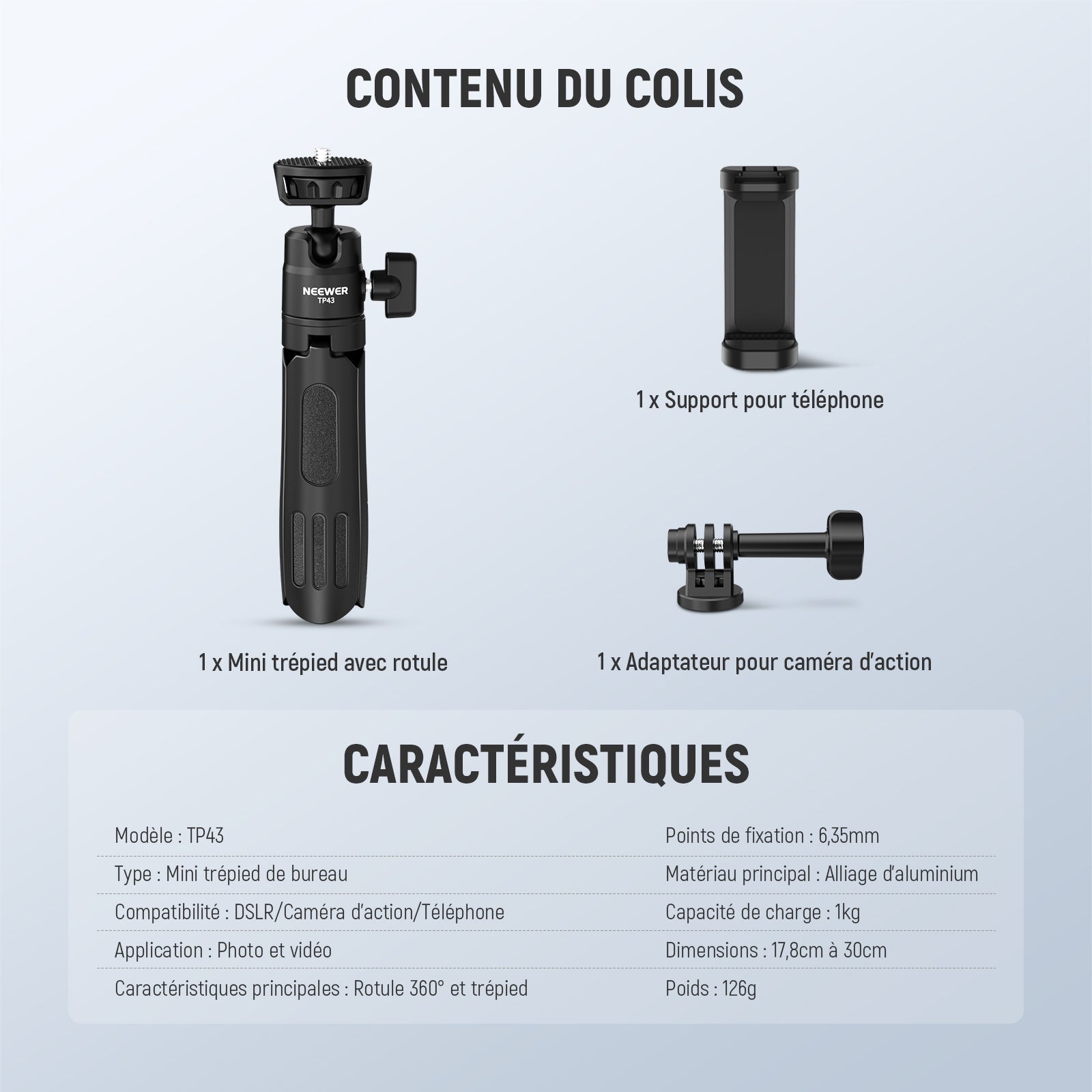 - Caractéristiques principales : Tête rotule à 360° et design trépied
