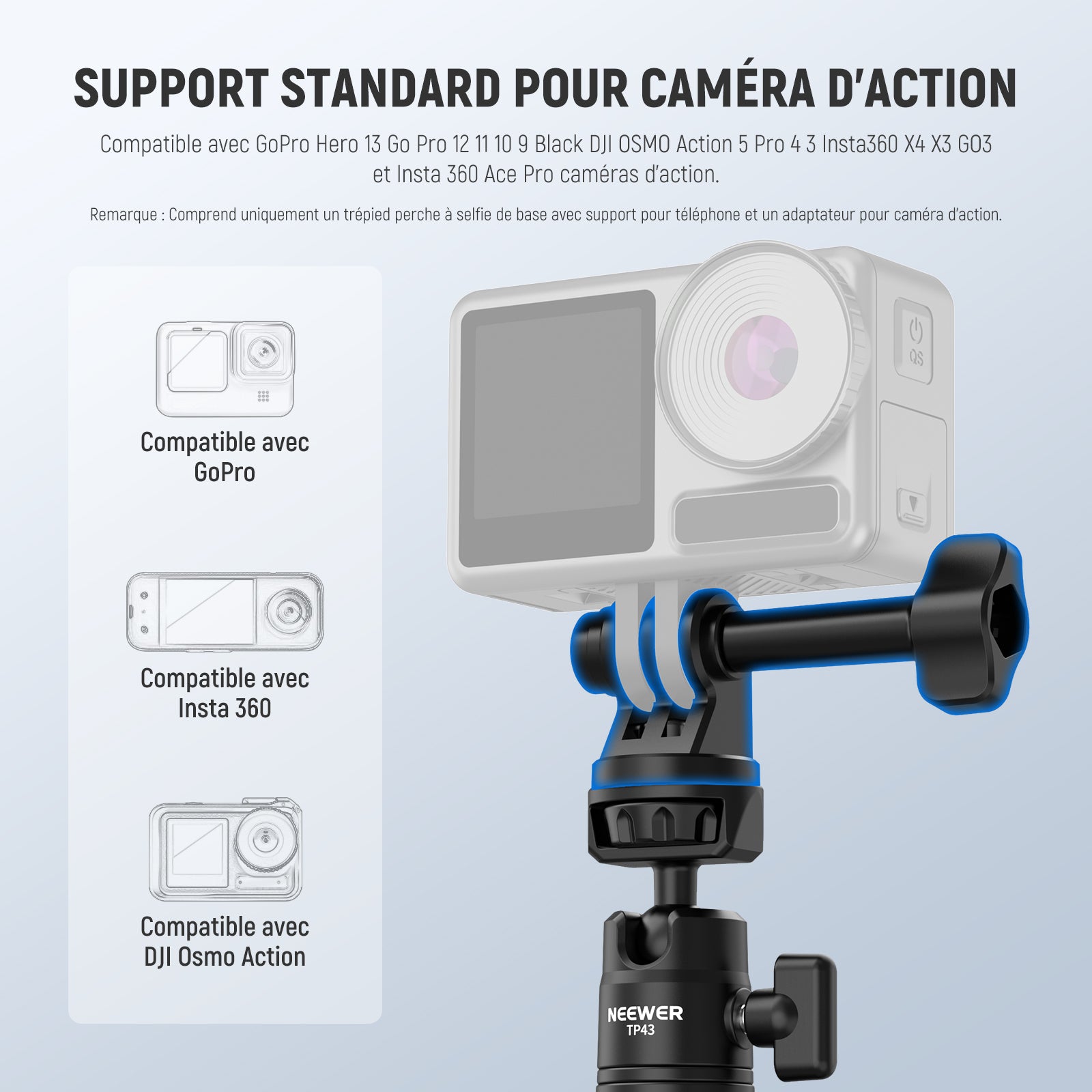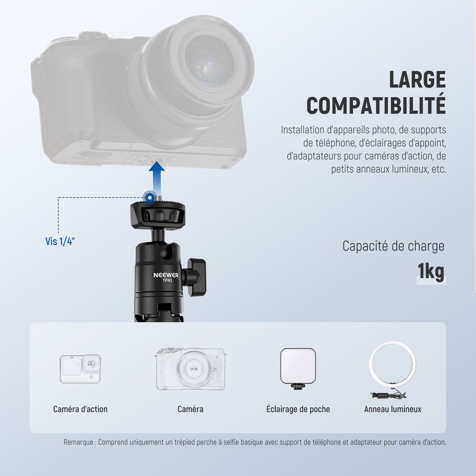 - Mini trépied pour perche à selfie de bureau : étendez complètement la perche à selfie pour l'utiliser comme un trépied de table, ou comme une poignée stabilisatrice, pour un changement rapide entre les modes de prise en main et de support. Fabriqué en alliage d'aluminium de qualité supérieure, le petit trépied de poche prend en charge votre caméra d'action ou smartphone (support de téléphone portable et adaptateur de caméra d'action inclus) via une vis supérieure de 6,35 mm, idéal pour le vlogging, le streaming en direct, l'enregistrement vidéo, la réalisation de films, etc. Charge maximale : 1 kg