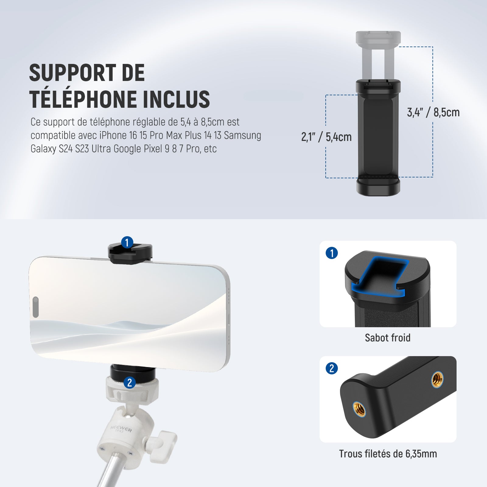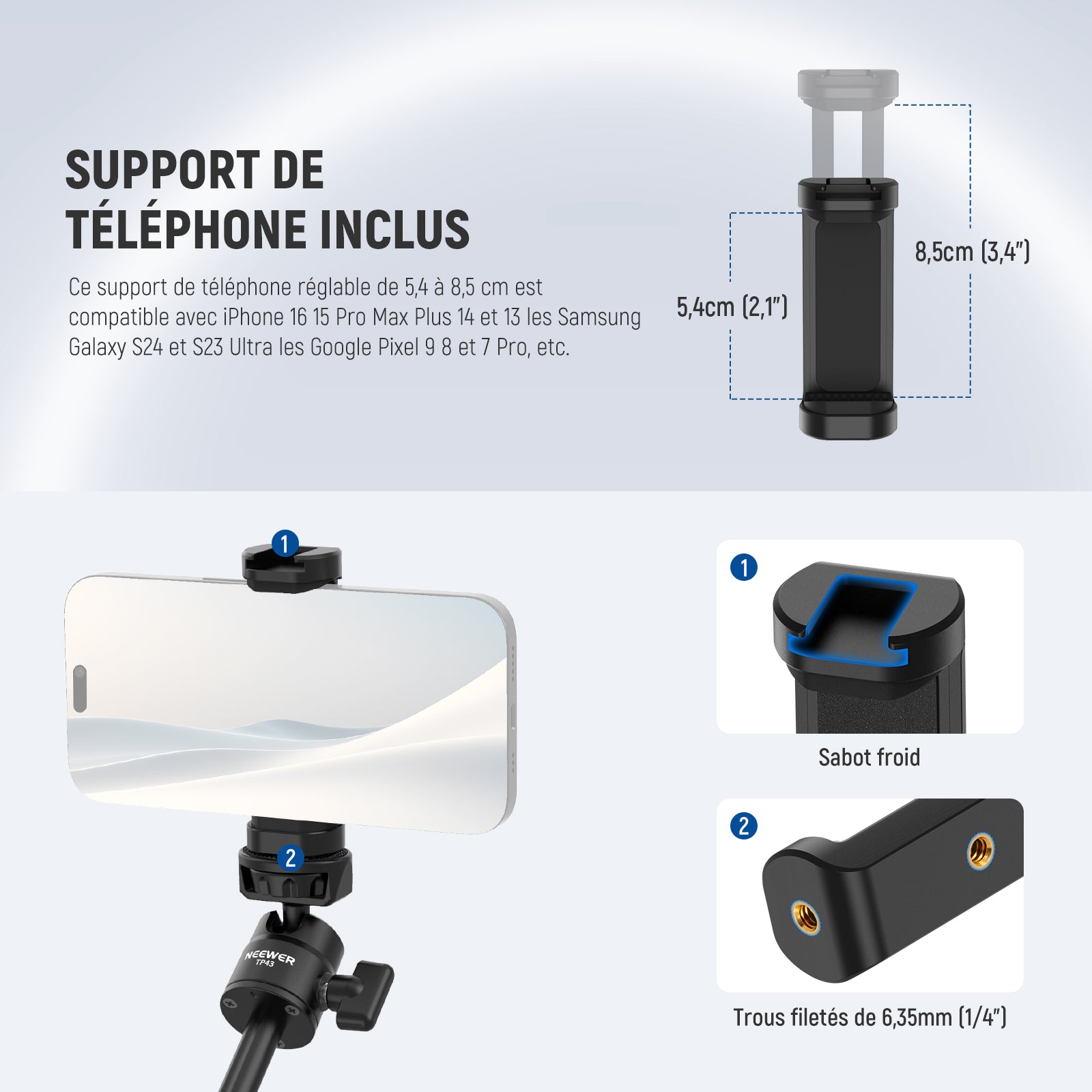 - Trépied pour téléphone et caméra d'action : le support de téléphone réglable est compatible avec iPhone 16 15 Pro Max Plus 14 13 Samsung Galaxy S24 S23 Ultra Google Pixel 9 8 7 Pro Android, avec une griffe froide pour les accessoires de photographie et de vidéographie, les équipements ou les équipements tels qu'un moniteur, une lumière de remplissage, un microphone. L'adaptateur de montage est compatible avec GoPro Hero 13 Go Pro 12 11 10 9 noir compatible avec DJI OSMO Action 5 Pro 4 3 compatible avec les caméras d'action Insta360 X4 X3 GO3 Insta 360 Ace Pro