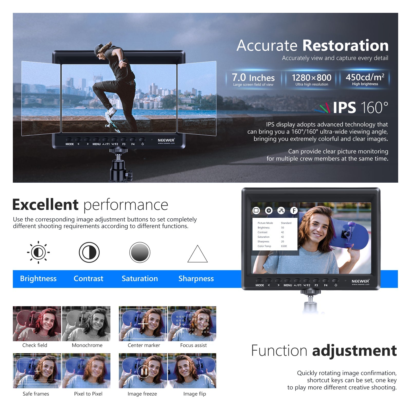• 【Moniteur de champ externe】 Doté d'un panneau IPS à grand angle de vue de 7 pouces et d'un design ultra fin de 17 mm avec rétroéclairage LED, d'une résolution HD 1280 x 800, d'une luminosité de 450 cd/m², d'un rapport de contraste de 1200:1 et d'un rapport d'aspect de 16 : 10, ce moniteur est pratique pour la prise de vue vidéo.