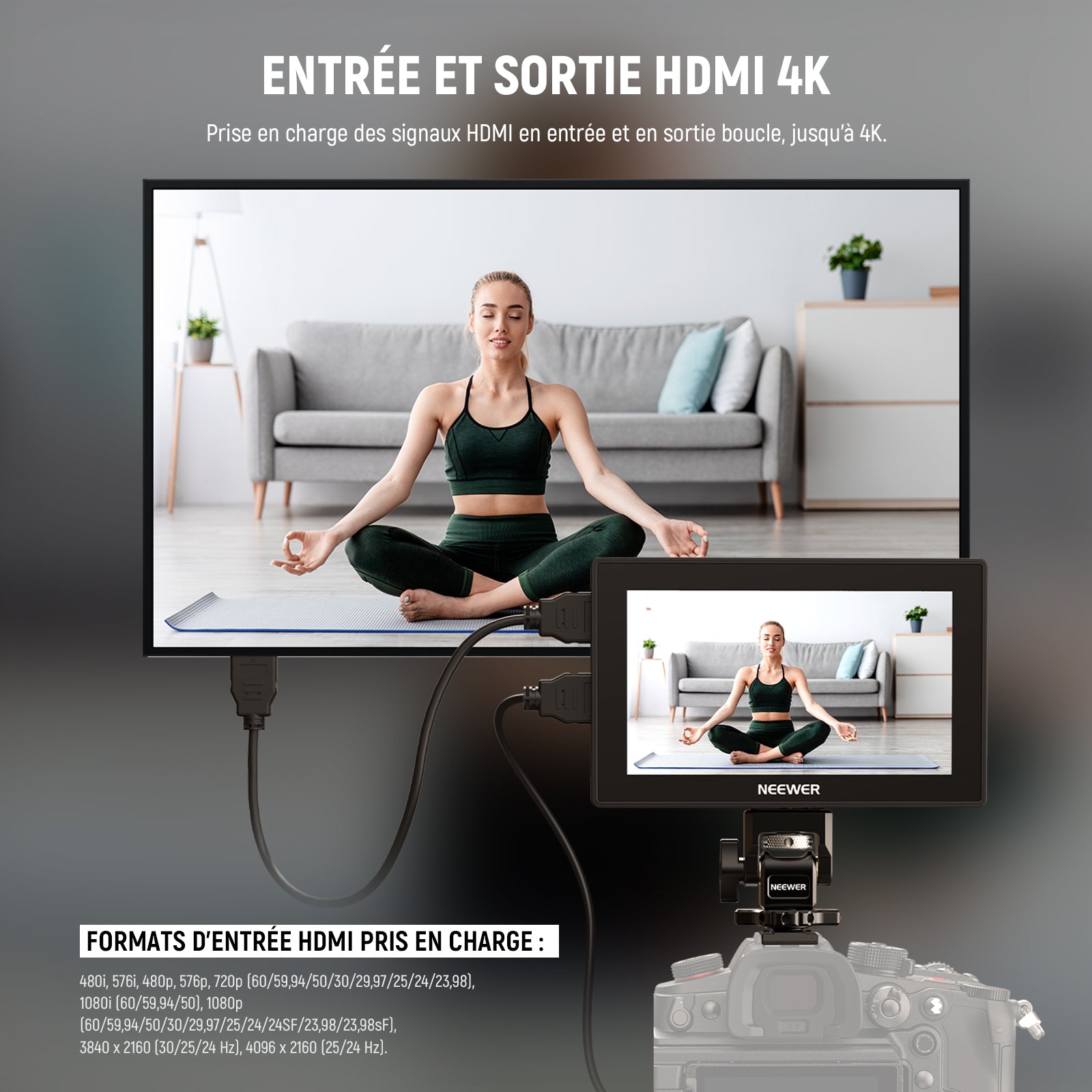 - 【Boucle d'entrée et de sortie HDMI 4K】Profitez d'une surveillance en temps réel grâce à l'entrée 4K UHD et à la boucle de sortie fluide. Partagez même l'écran en direct sur des écrans ou des projecteurs plus grands sans délai. Prise en charge des entrées HDMI 4K UHD 3840 x 2160p (30/29,97/25/24/23,98 Hz), 4096 x 2160p (24 Hz) et 480i/480p/576i/576p/720p/1080i/1080p. Cet écran de caméra est équipé d'une prise casque 3,5mm pour une surveillance audio simultanée en temps réel (casque non inclus).