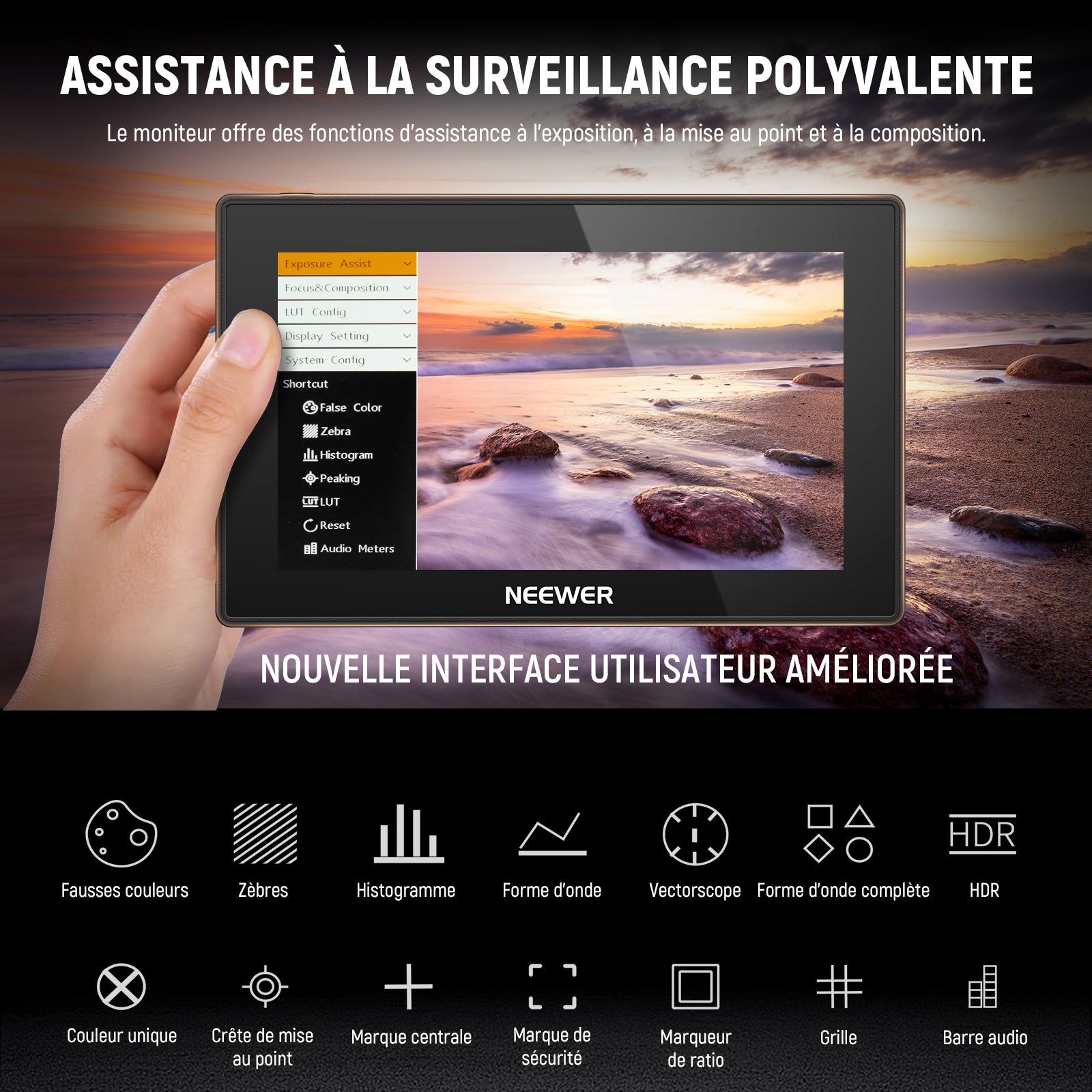 - 【Outils de surveillance complets】Ce moniteur vidéo pour caméra, utilisé comme équipement de vidéographie, intègre une suite complète d'outils de surveillance professionnels, incluant un affichage complet de la forme d'onde, un histogramme de luminance, des motifs zébrés, un mode monochrome et un mode fausses couleurs, vous permettant de contrôler précisément la composition, la mise au point et l'exposition pendant la prise de vue. Mise à jour du firmware possible via une carte SD (non fournie).