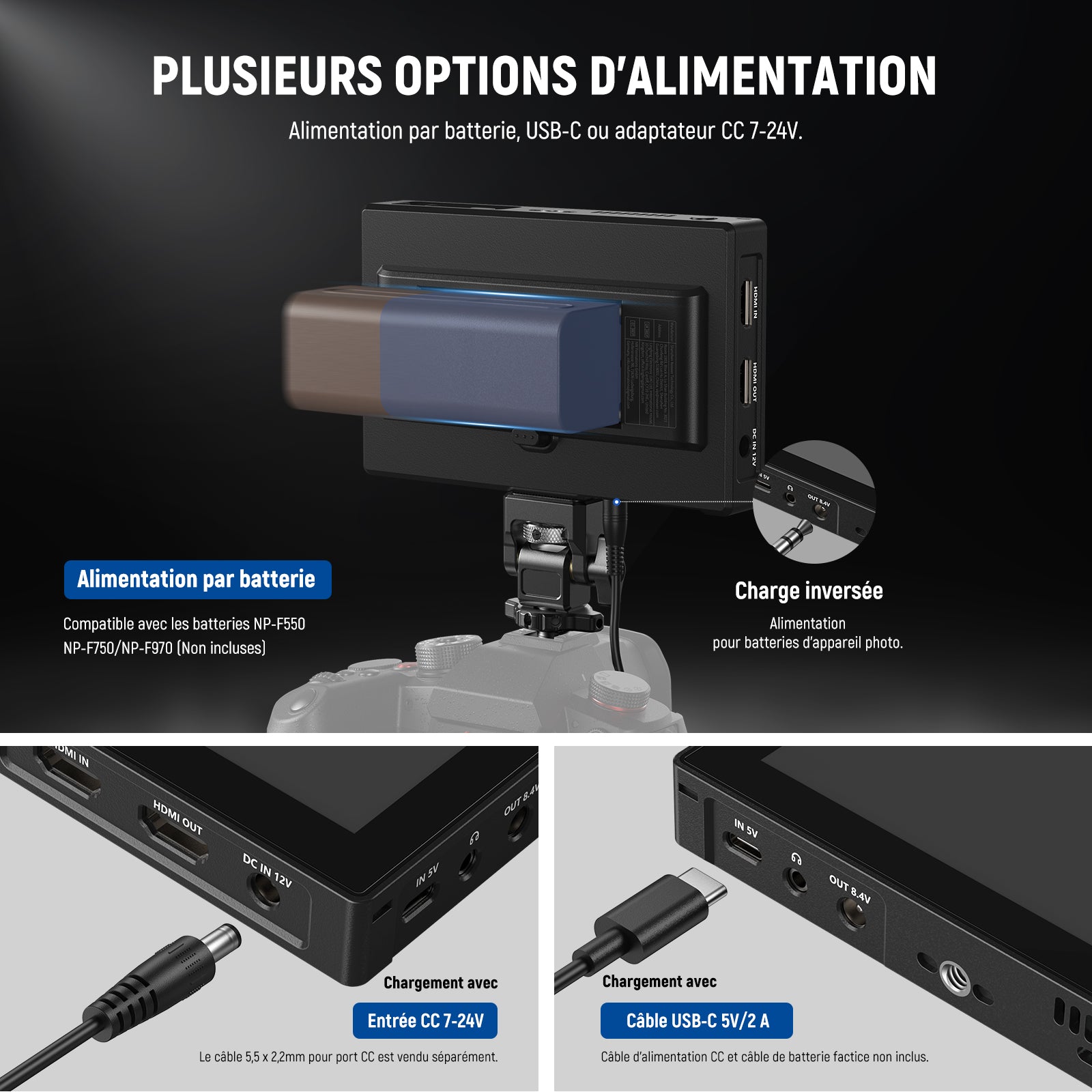 - Alimentation : 5,5mm CC 7-24V, USB C 5V/2A, piles NP-F