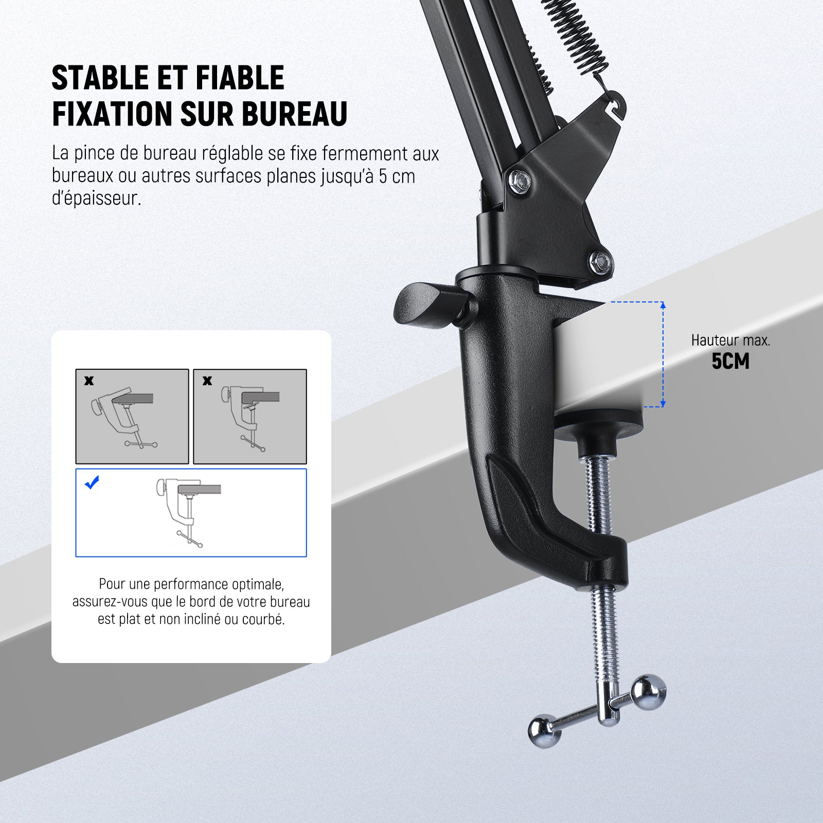 - 【Fixation stable et fiable sur bureau】 La pince de fixation réglable se fixe fermement sur les bureaux ou autres surfaces planes jusqu'à 5 cm d'épaisseur. Ses patins en caoutchouc antidérapants protègent votre bureau des rayures. Pour des performances optimales, assurez-vous que le bord de votre bureau soit plat et non incliné.