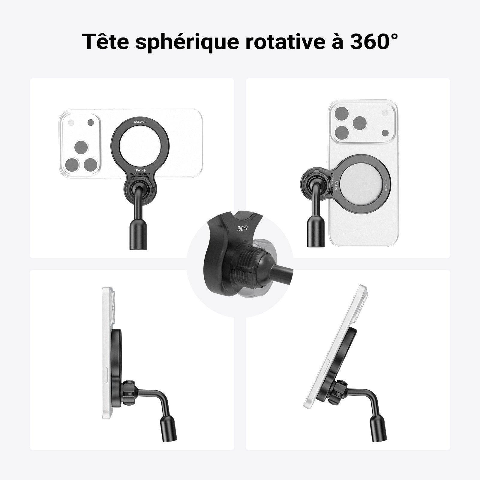 - 【Rotule à 360° pour des angles flexibles】 Compatible avec MagSafe, ce support pivote à 360° et s'adapte facilement du mode paysage au mode portrait pour des prises de vue vidéo stables et flexibles.