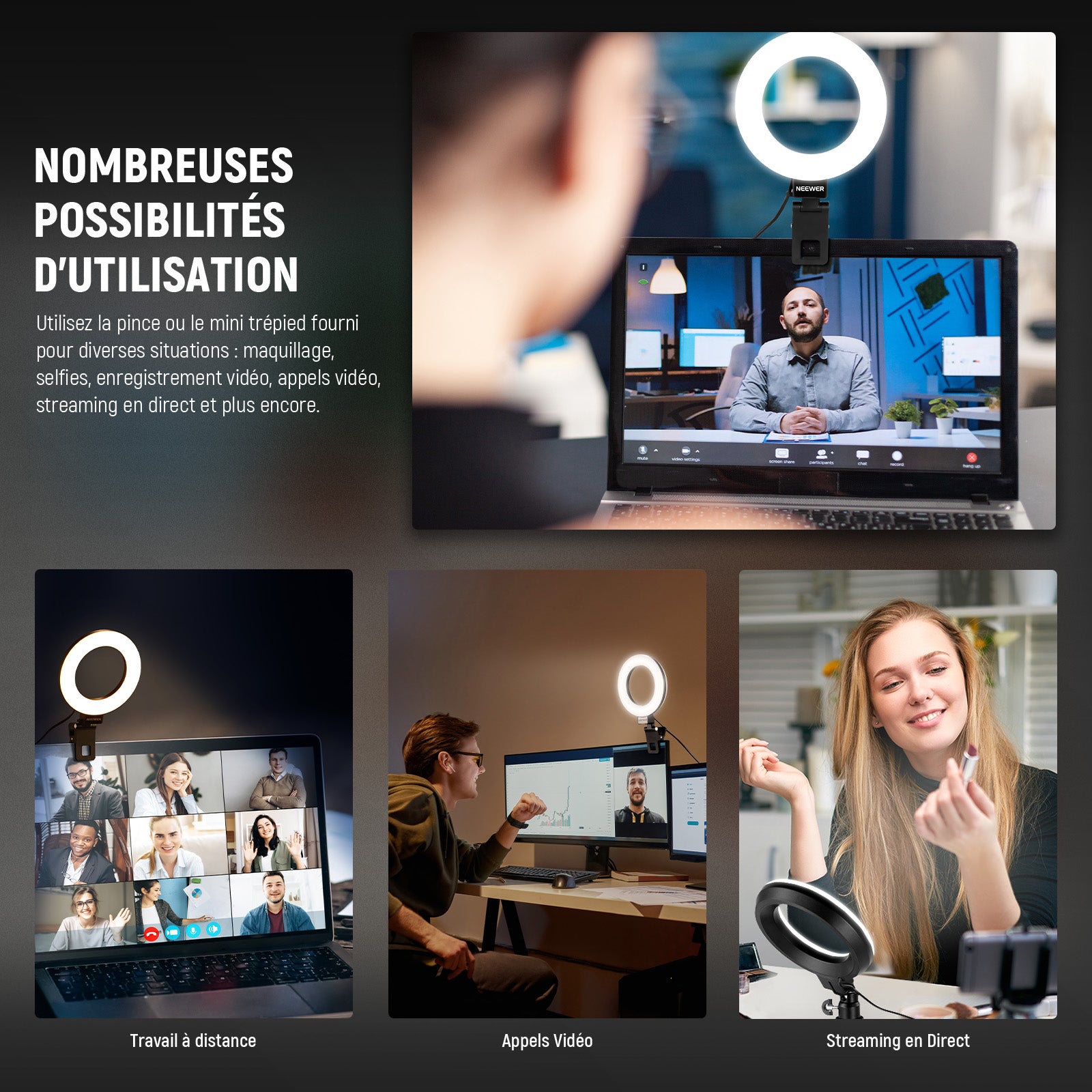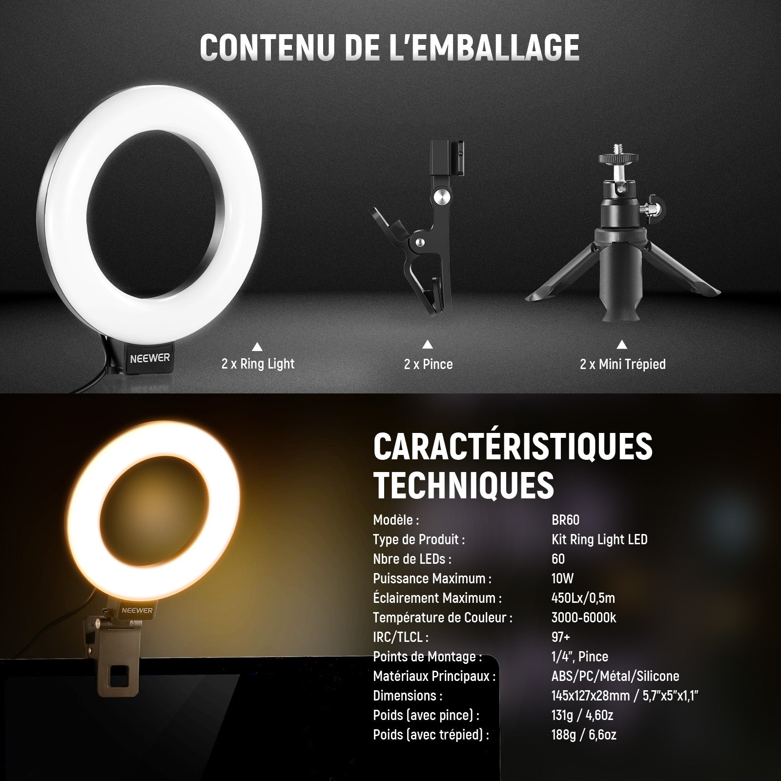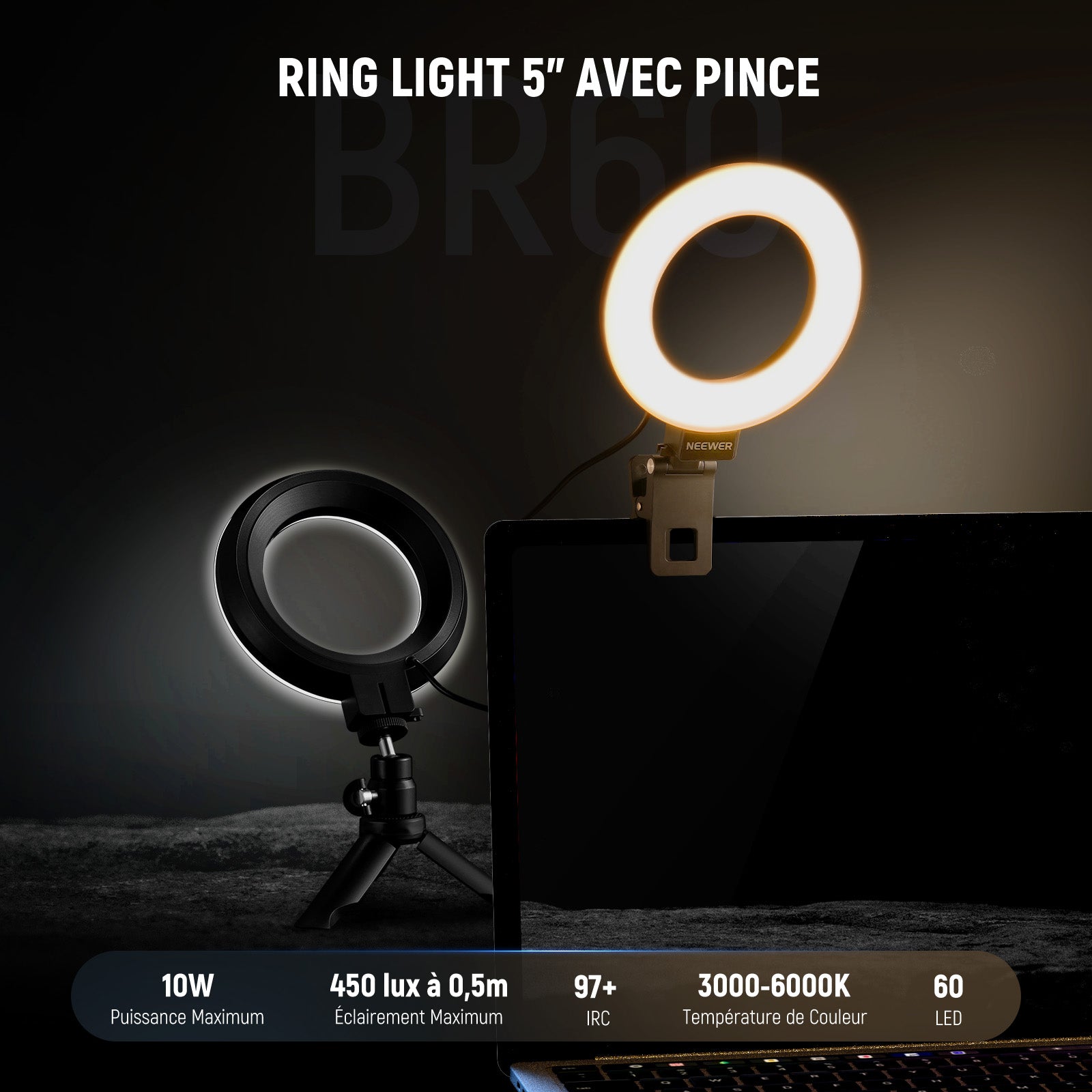 - 【Lumière de remplissage LED polyvalente avec clip】 Équipé de 60 LED, l'anneau lumineux NEEWER BR60 offre jusqu'à 450Lx d'éclairage à 0,5m, une température de couleur de 3000K-6000K et un IRC> 97. La lampe à clip peut être montée sur des smartphones, des ordinateurs portables, des ordinateurs,des écrans de bureau et des moniteurs d'une épaisseur inférieure à 2,5cm,et comprend un mini trépied pour une utilisation polyvalente dans le maquillage,les selfies,l'enregistrement vidéo Tiktok/Youtube,etc.