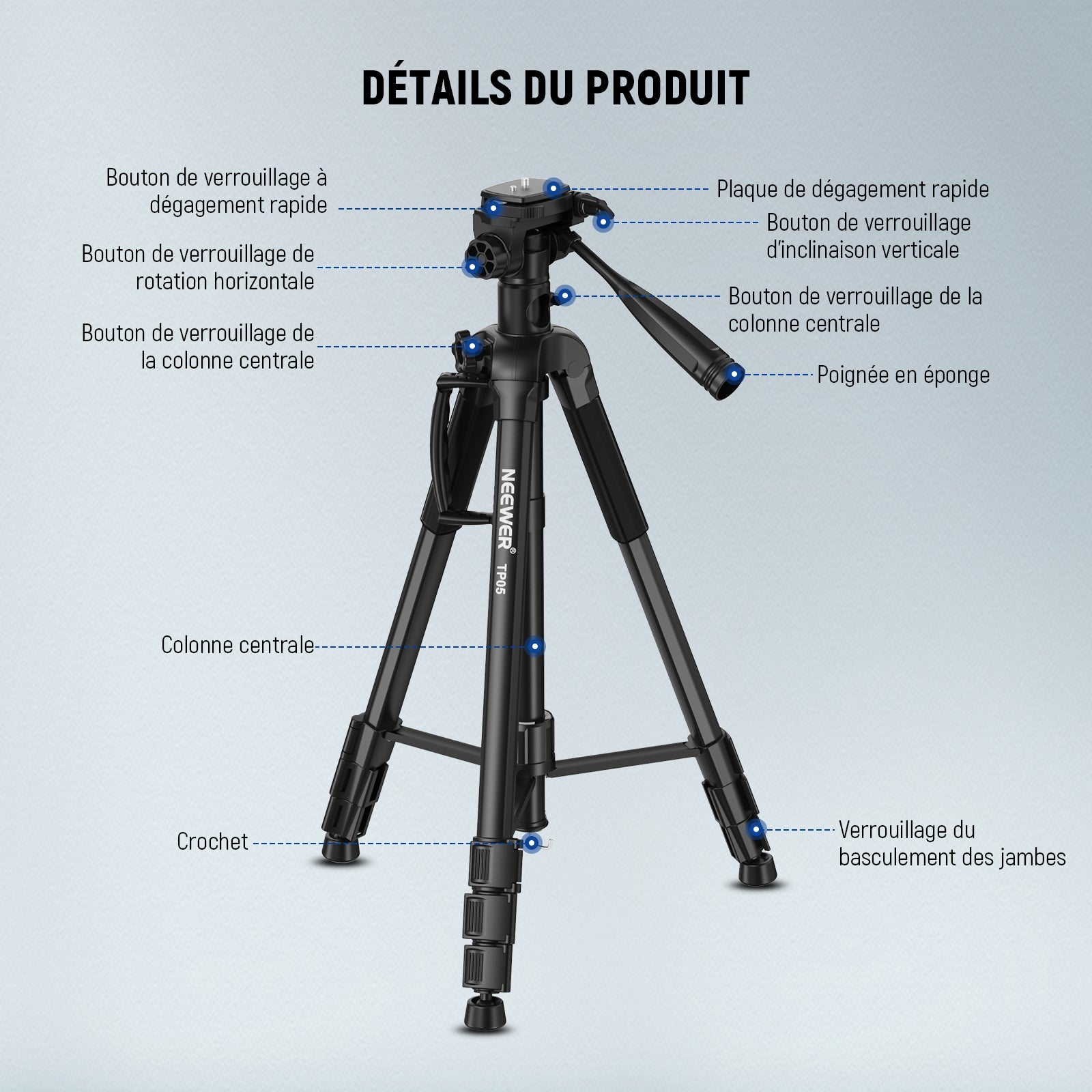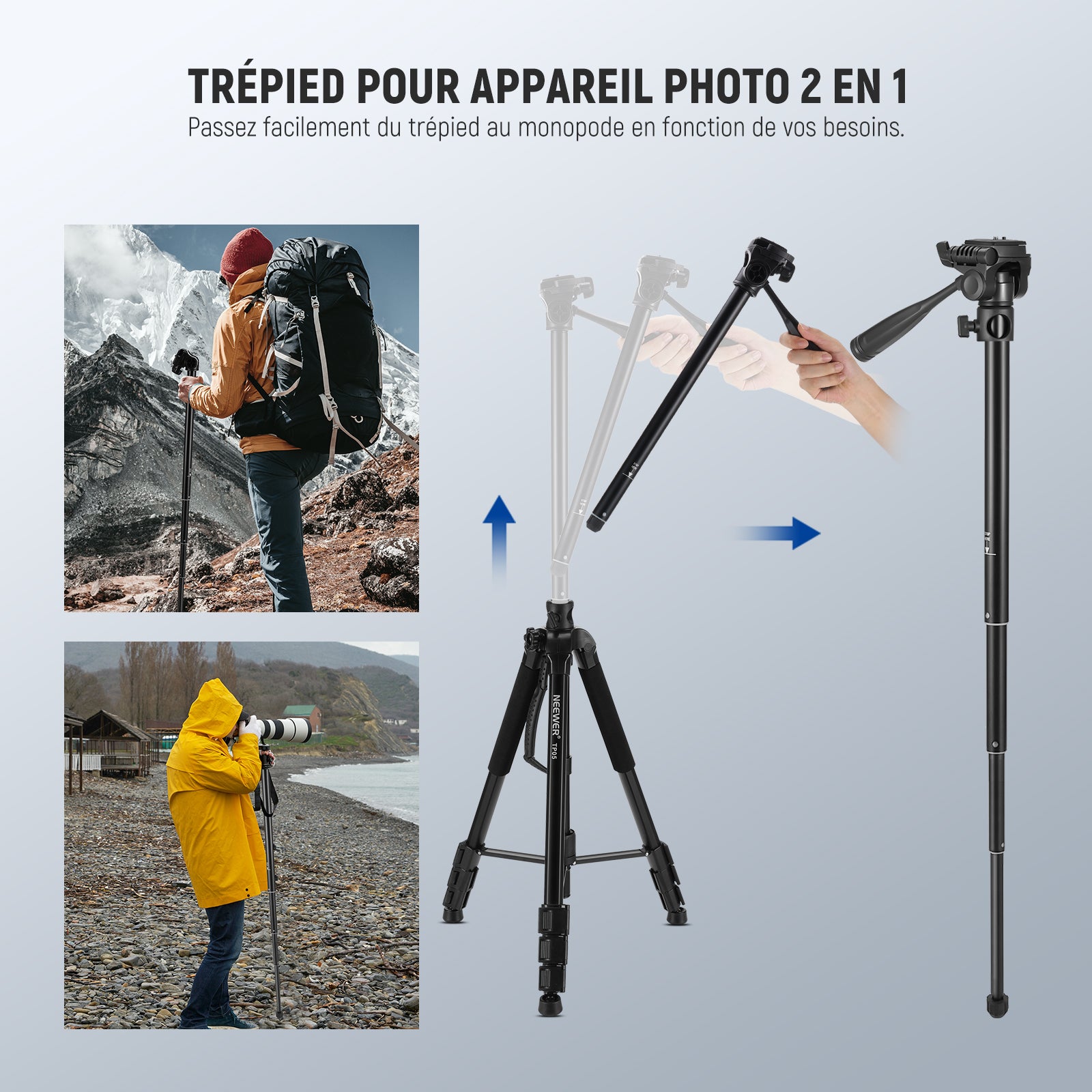 - Se transforme en monopode : avec une hauteur réglable de 60 cm à 189 cm, ce trépied à 4 sections offre une flexibilité pour différents scénarios de prise de vue. L'un des tubes de trépied peut être rapidement démonté et connecté à l'axe central pour se transformer en monopode, s'étendant de 47 cm à 174 cm sur cinq sections pour plus de polyvalence