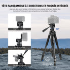 - Tête inclinable à 3 voies et poignée intégrée : avec une tête inclinable à 3 voies, vous pouvez facilement réaliser des transitions harmonieuses de compositions horizontales à verticales. La poignée intégrée et le niveau à bulle assurent des ajustements rapides et faciles, tandis que les pieds en caoutchouc antidérapants rotatifs à 720° offrent une stabilité sur tous les terrains. Idéal pour le vlogging, le streaming en direct, l'enregistrement vidéo, la réalisation de films