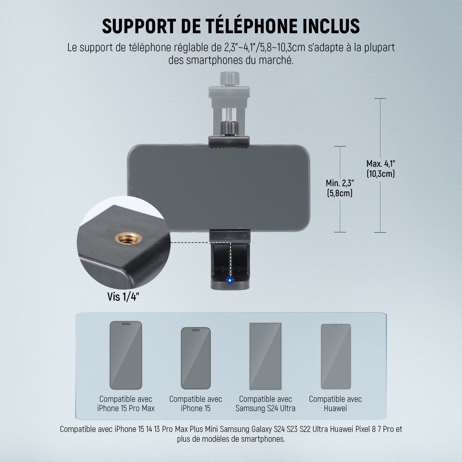 - Porte-téléphone inclus: Le support de téléphone élargi de 2,3"-4,1"/5,8-10,3cm est compatible avec iPhone 16 15 14 13 Pro Max Plus Samsung Galaxy S24 S23 S22 Ultra Huawei Google Pixel 9 8 7 Pro et plus de modèles de smartphones, idéal pour les selfies, la photographie, le vlogging, l'enregistrement vidéo, la diffusion en direct, etc.