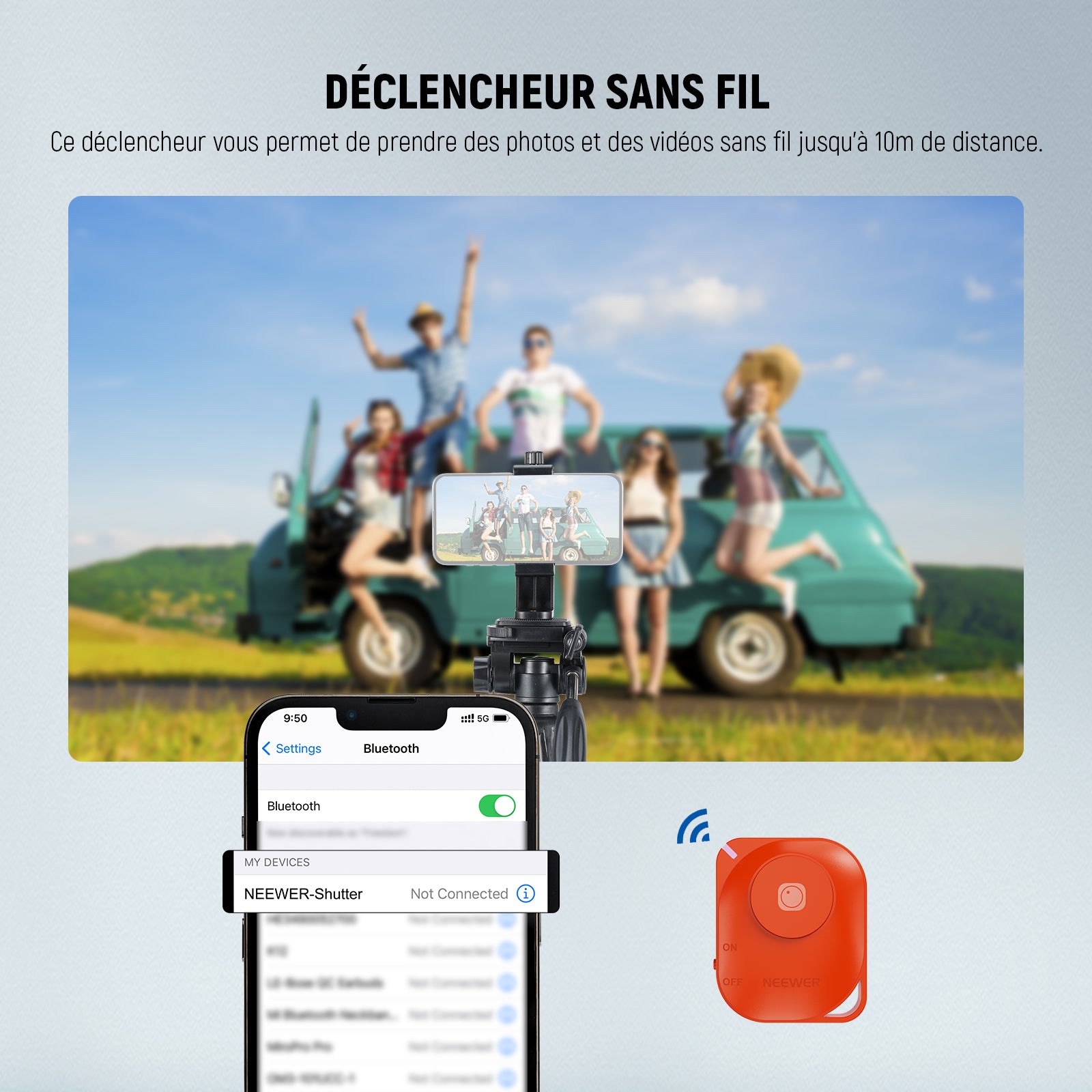 - Trépied pour caméra robuste avec télécommande- Fabriqué en alliage d'aluminium, ce trépied pour caméra vidéo robuste permet de fixer solidement les appareils photo reflex numériques, les caméras d'action (adaptateur non inclus) ou les smartphones (support inclus) jusqu'à 17,6 lb/8 kg. Pesant seulement 3,9 lb/1,75 kg, le trépied pour caméra se replie pour atteindre une taille compacte de 11,4 "x2,95 “x2,2” (290x75x55mm) et est doté d'une poignée de transport intégrée et d'un sac pour la photographie en déplacement. Comprend également un déclencheur Bluetooth pour déclencher à distance (≤33ft/10m, sans obstacle).