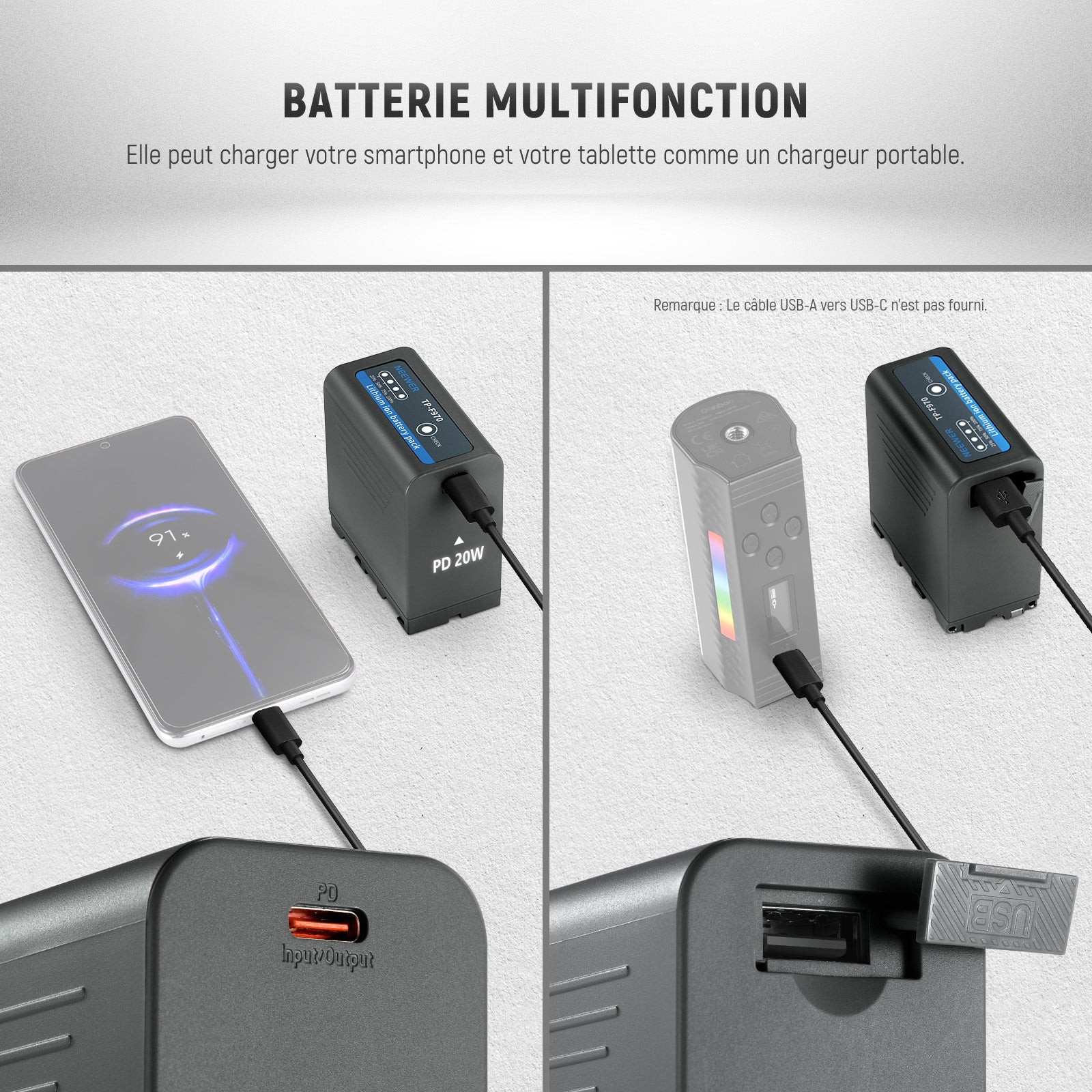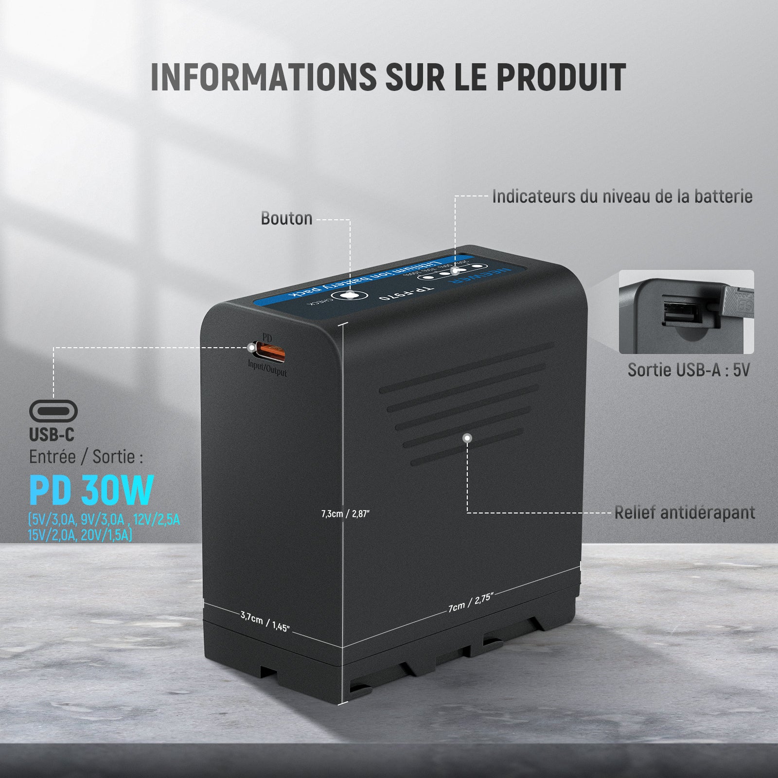 - 【Deux Ports et Recharge Facile】La batterie NP-F970 est équipée d'un port USB-A et d'un port USB-C bidirectionnel. Le port USB-C peut servir d'entrée ou de sortie et prend en charge la charge rapide PD 30W pour une charge complète en 2,5heures. Le port USB-A dispose d'une sortie 5V pour recharger smartphones et tablettes. Rechargez la batterie via une prise murale, un chargeur de voiture ou un chargeur portable.