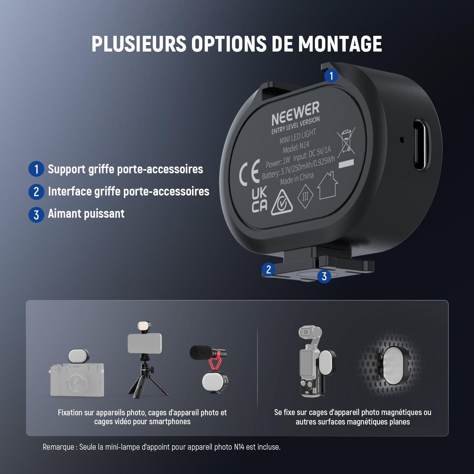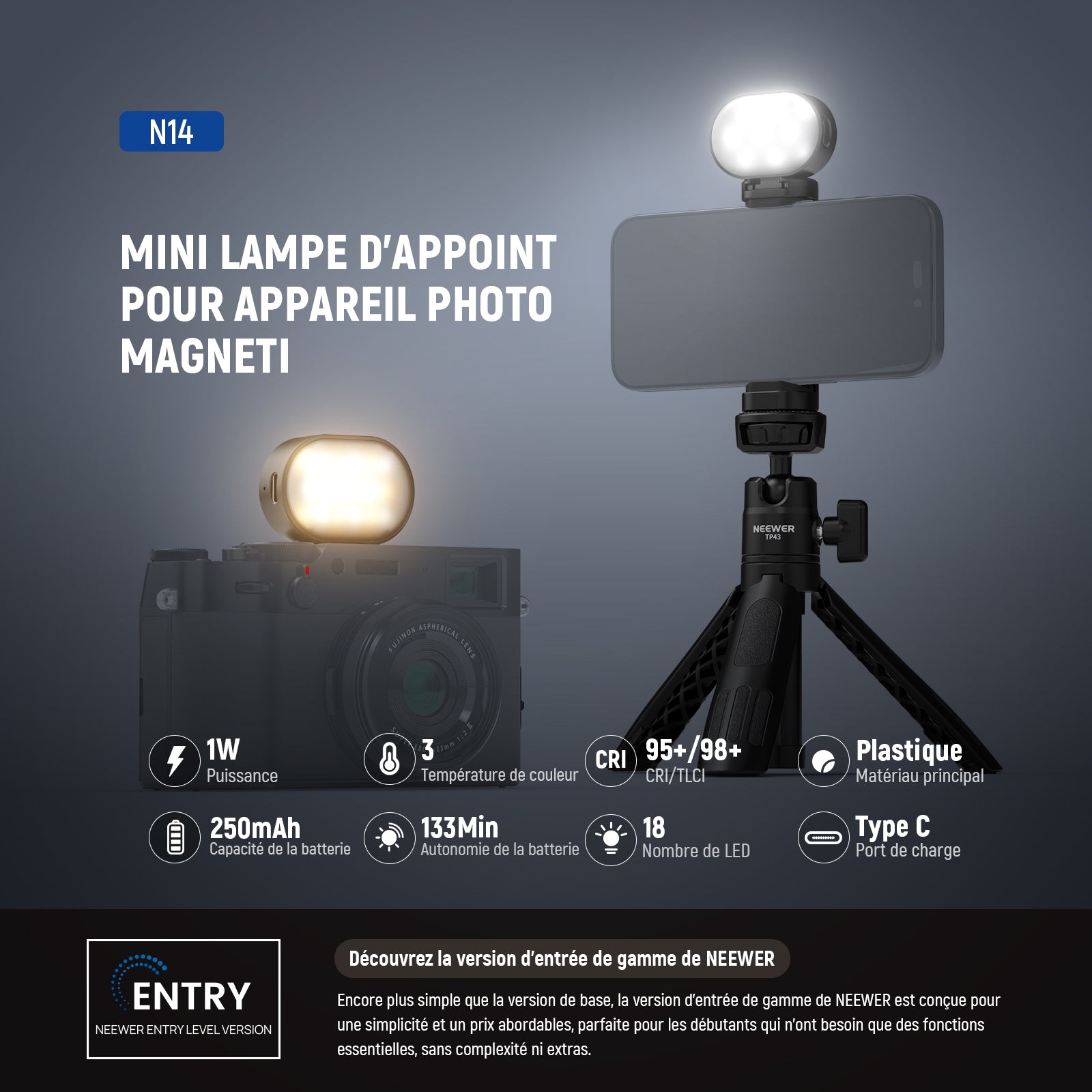 - 【Présentation de NEEWER ENTRY LEVEL VERSION】Encore plus simple que BASICS,NEEWER ENTRY LEVEL VERSION est conçue avec une simplicité et un prix abordable ultimes à l'esprit, parfaite pour les débutants absolus qui n'ont besoin que des fonctions les plus essentielles sans aucune complexité ni extras. Le N14 est un mini-éclairage d'appoint léger pour appareil photo et téléphone, doté d'une longue autonomie et d'un chargement USB facile. Il est idéal pour les créateurs de contenu, les streamers.