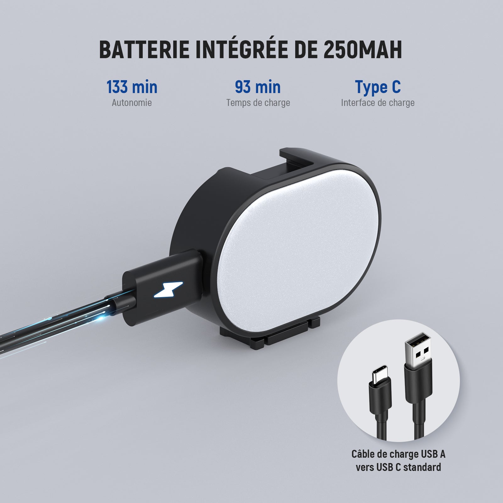 - 【Autonomie de 133 minutes et charge rapide par USB-C】 Batterie rechargeable intégrée de 250 mAh offre un éclairage continu jusqu'à 2 heures et 13 minutes à pleine luminosité avec une charge complète. Elle se recharge complètement en 93 minutes via un chargeur portable, un ordinateur portable, un chargeur de voiture ou toute autre source d'alimentation USB grâce au câble de charge USB-C fourni. Un éclairage idéal pour la création de contenu en extérieur