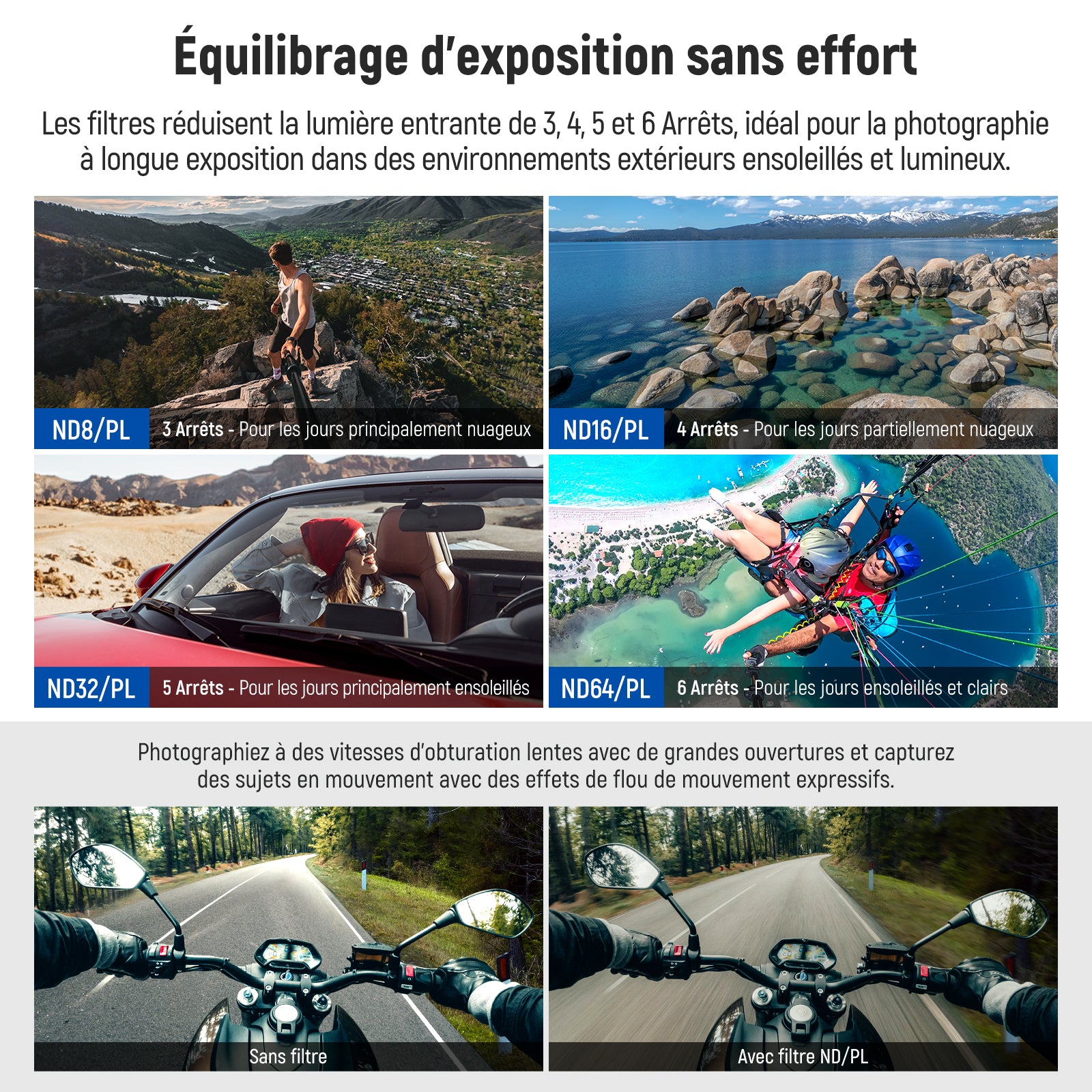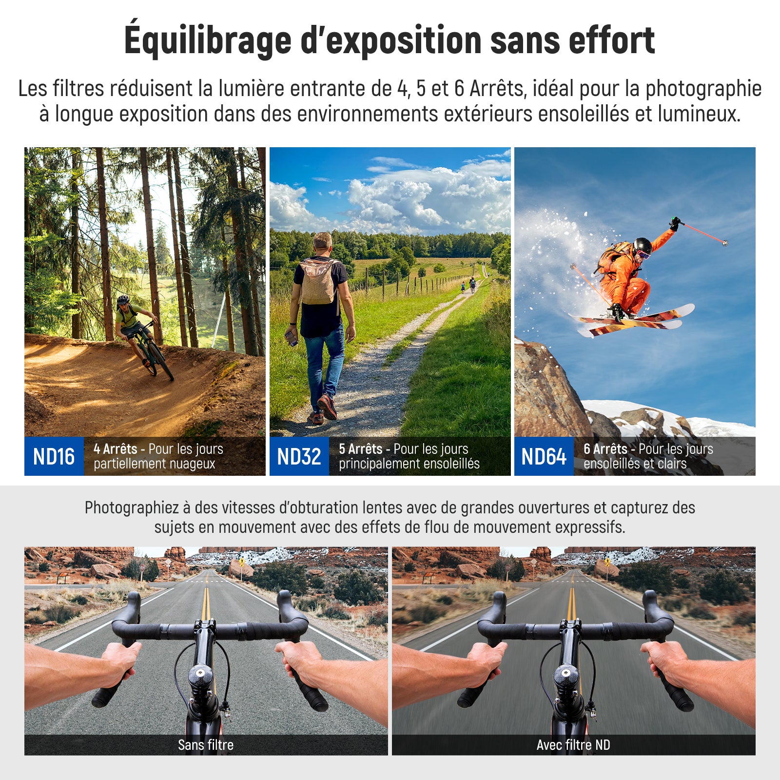 - 【Enregistrement d'images parfaitement exposées】 les filtres ND8, ND16 et ND32 réduisent la lumière de 3, 4 ou 5 arrêts, parfaits pour les expositions à long terme en plein soleil. Ils permettent des prises de vue avec des vitesses d'obturation plus longues et des ouvertures plus grandes ainsi que l'enregistrement de sujets en mouvement avec des effets de flou de mouvement dynamiques