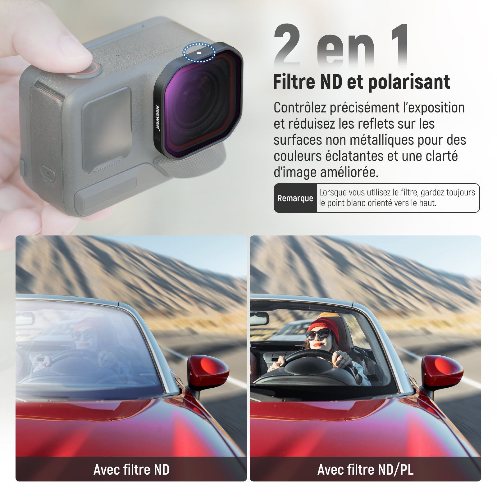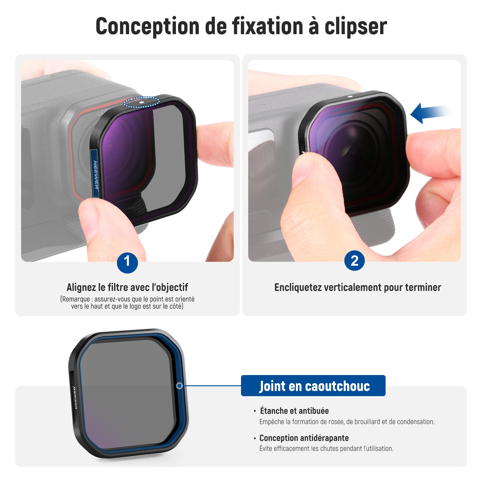 - 【Fixation pratique à clipser】 Fixez instantanément la caméra d'action et vous êtes prêt à partir. Pas besoin de retirer l'objectif d'origine. Les intérieurs antidérapants maintiennent les filtres fermement en place